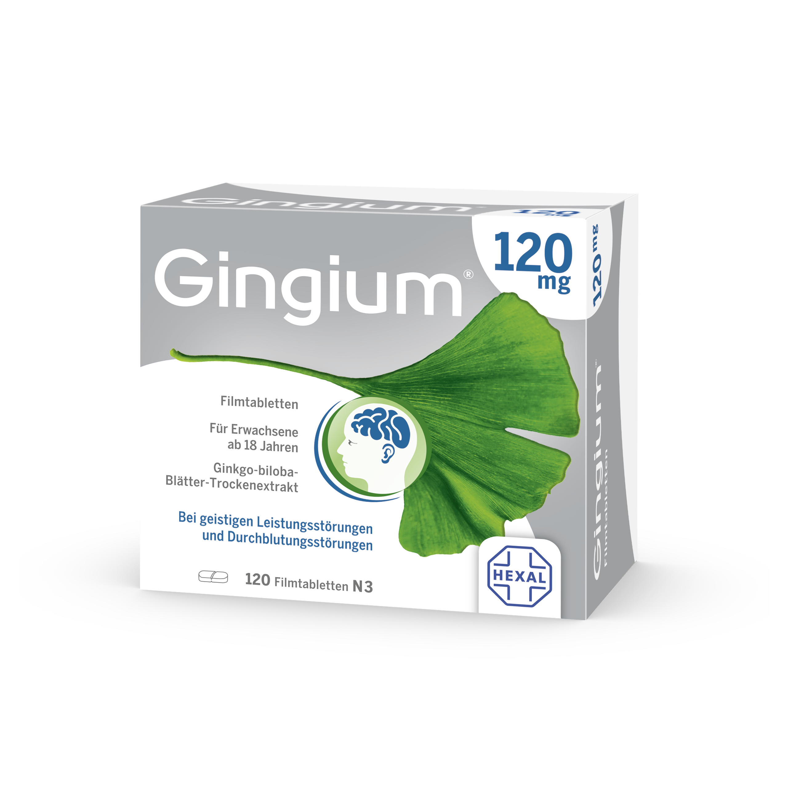 Damit das Gehirn seinen vielfältigen Aufgaben gut nachkommen kann, braucht es ausreichend Nährstoffe und Sauerstoff. Gingium® 120 mg hilft dabei, indem es die Durchblutung im Gehirn fördert und dadurch Gedächtnis und Konzentration verbessert.* Zudem unterstützt Gingium® 120 mg durch die bessere Durchblutung auch die Regeneration des Innenohrs bei Tinnitus**. Der hochwertige Spezialextrakt wird aus den Blättern des Ginkgo-Baumes gewonnen, weist eine hohe Konzen- tration natürlicher Wirkstoffe (Ginkgoflavonglykoside, Terpenlactone) auf und ist gut verträglich.