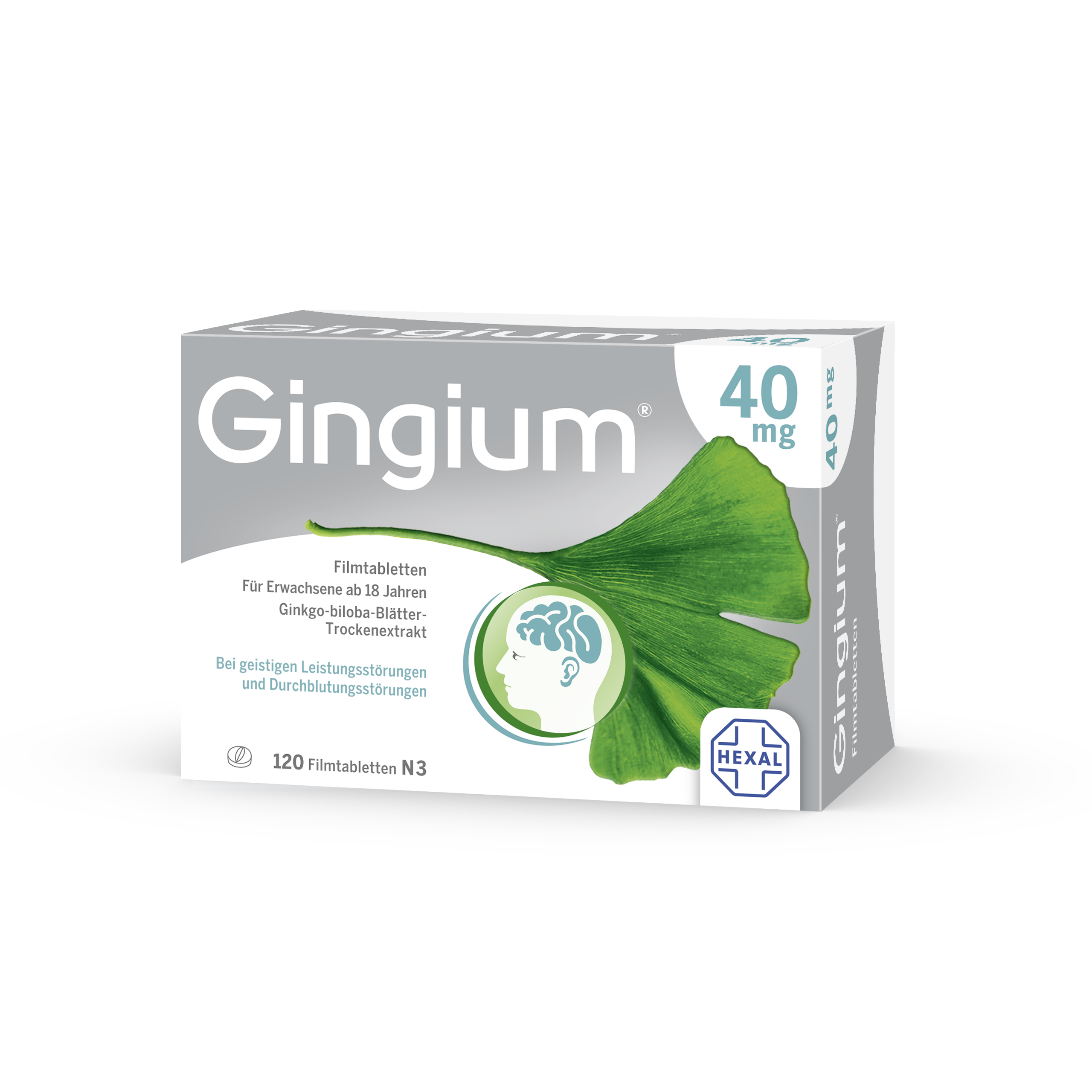 Damit das Gehirn seinen vielfältigen Aufgaben gut nachkommen kann, braucht es ausreichend Nährstoffe und Sauerstoff. Gingium® 40 mg hilft dabei, indem es die Durchblutung im Gehirn fördert und dadurch Gedächtnis und Konzentration verbessert.a Zudem kann Gingium® 40 mg durch die bessere Durchblutung auch die Regeneration des Innenohrs bei Tinnitusb unterstützen. Der hochwertige Spezialextrakt wird aus den Blättern des Ginkgo-Baumes gewonnen, weist eine hohe Konzentration natürlicher Wirkstoffe (Flavonglykoside, Terpenlactone) auf und ist gut verträglich.