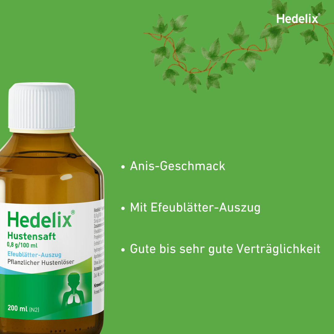 Hedelix Hustensaft ist ein pflanzliches Arzneimittel bei Erkältungskrankheiten der Atemwege. Hedelix Hustensaft wird angewendet bei Erkältungskrankheiten der Atemwege, zur Besserung der Beschwerden bei chronisch-entzündlichen Bronchialerkrankungen. Bei länger anhaltenden Beschwerden oder beim Auftreten von Atemnot, Fieber wie auch bei eitrigem oder blutigem Auswurf sollte umgehend ein Arzt aufgesucht werden.