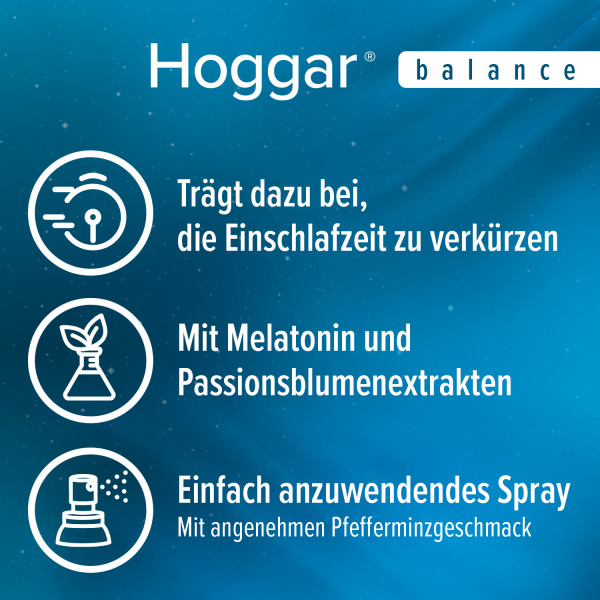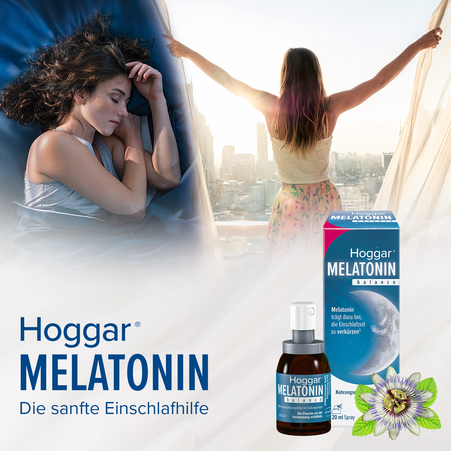 Hoggar® Melatonin Spray ist ein einfach anzuwendendes Direktspray mit dem Müdemacher Melatonin, Passionsblumenextrakt und dem Nervenvitamin B6**.