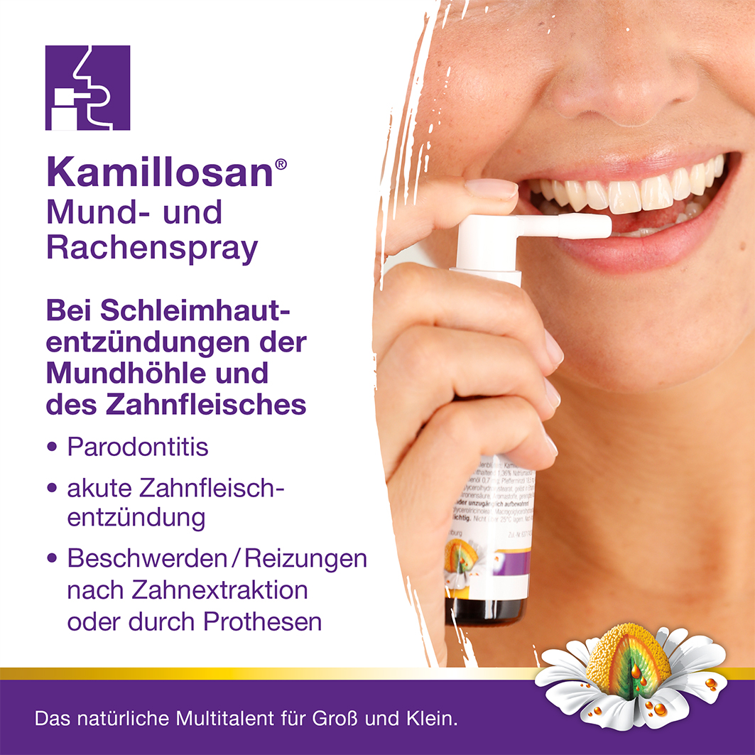 - ENTZÜNDUNGSHEMMENDE PFLEGE: Bei leichten Entzündungen der Haut, der Mundschleimhaut und des Zahnfleisches wirkt das Kamillosan Rachenspray entzündungshemmend und wundheilungsverbessernd