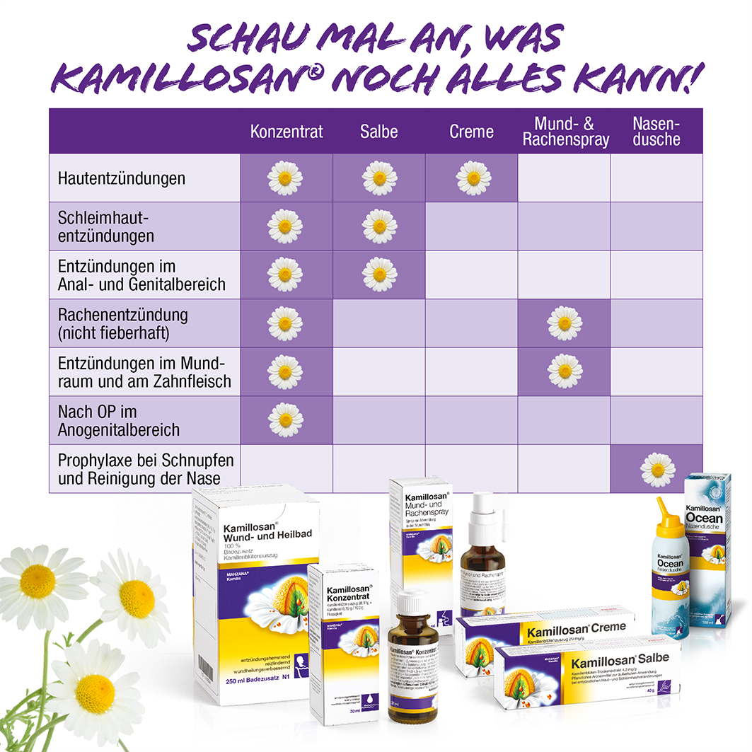 Der Extrakt aus der Kamillenblüte hat eine entzündungshemmende, antibakterielle und wundheilungsfördernde Wirkung.