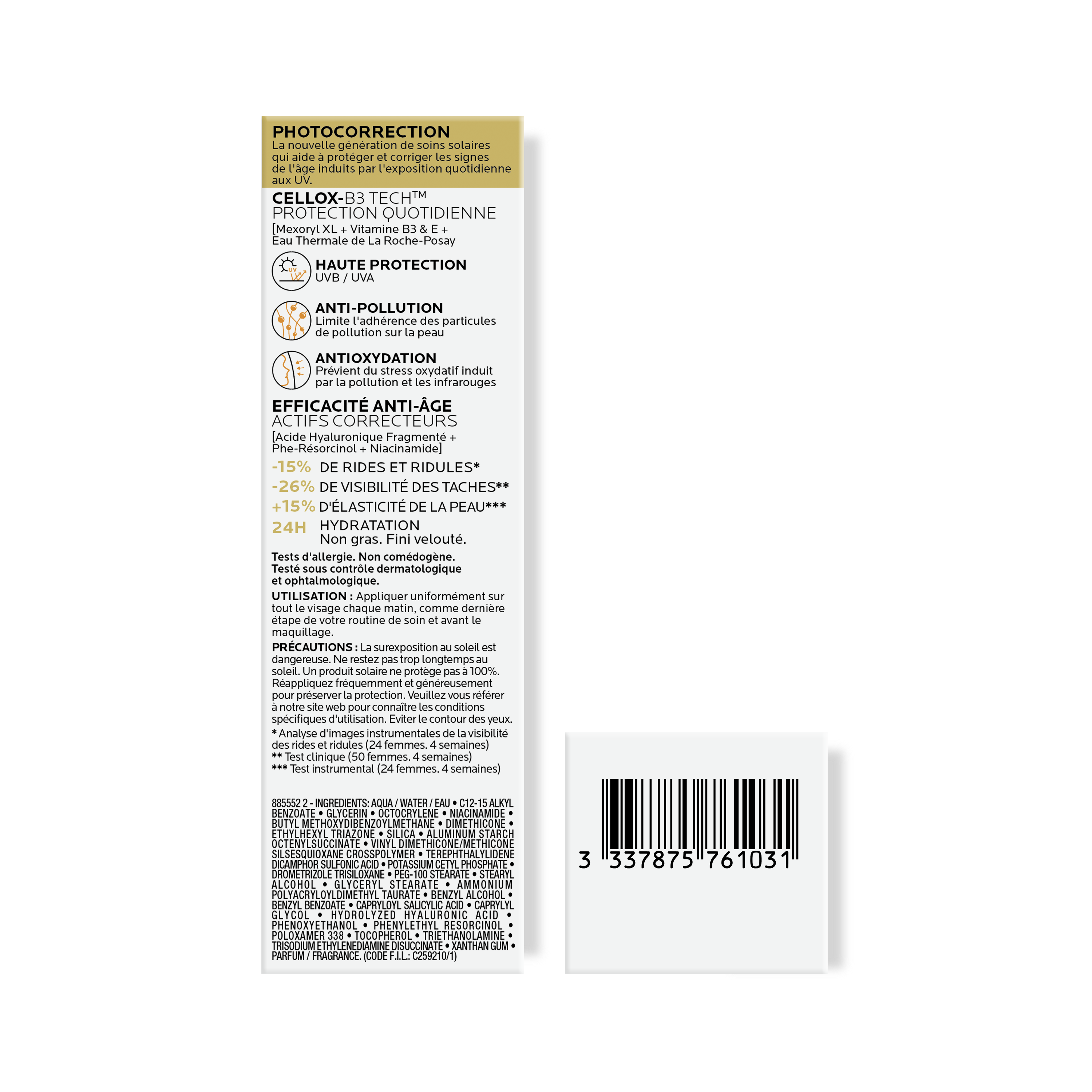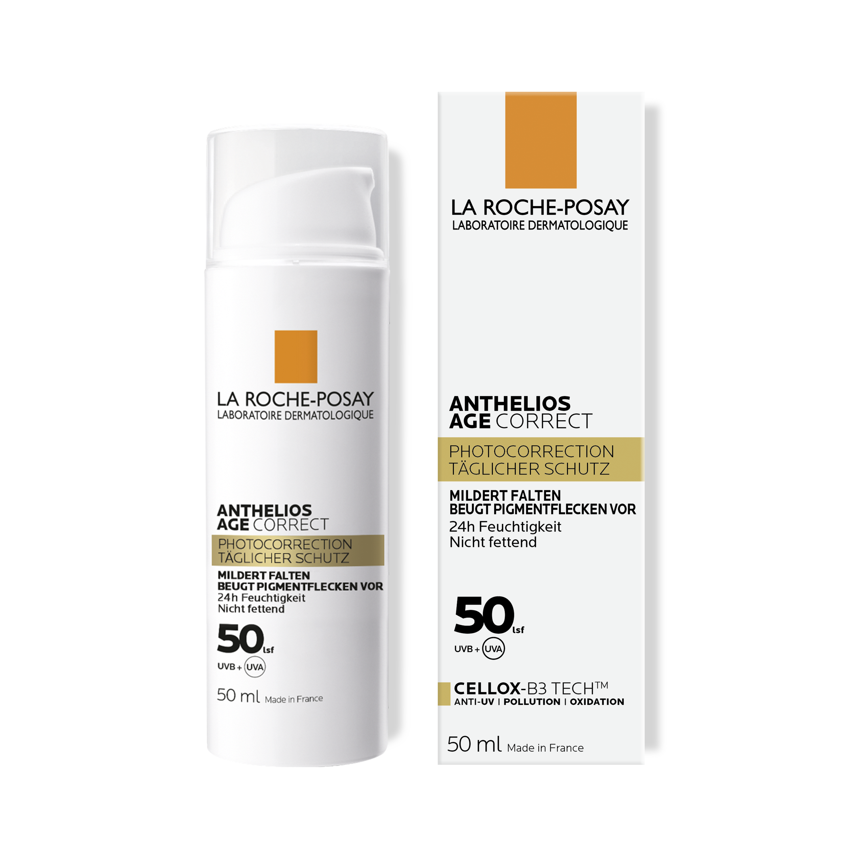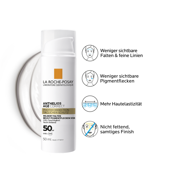 Die La Roche Posay Anthelios Age Correct LSF 50 Creme kombiniert täglichen Sonnenschutz & Anti-Age Pflege in Einem. Sie schützt vor Hautalterung und korrigiert gleichzeitig die Zeichen von Hautalterung in 4 Wochen. Falten und Pigmentflecken werden dank den kraftvollen Anti-Age Wirkstoffen Hyaluronsäure, Phe-Resorcinol und Niacinamid reduziert, und die Hautelastizität wird gestärkt. Dank einer neuen Generation der Sonneschutz-Technologie, CELLOX-B3 TECH, werden Zellschäden durch UV- & Infrarot-Strahlen sowie durch Umwelteinflüsse begrenzt.