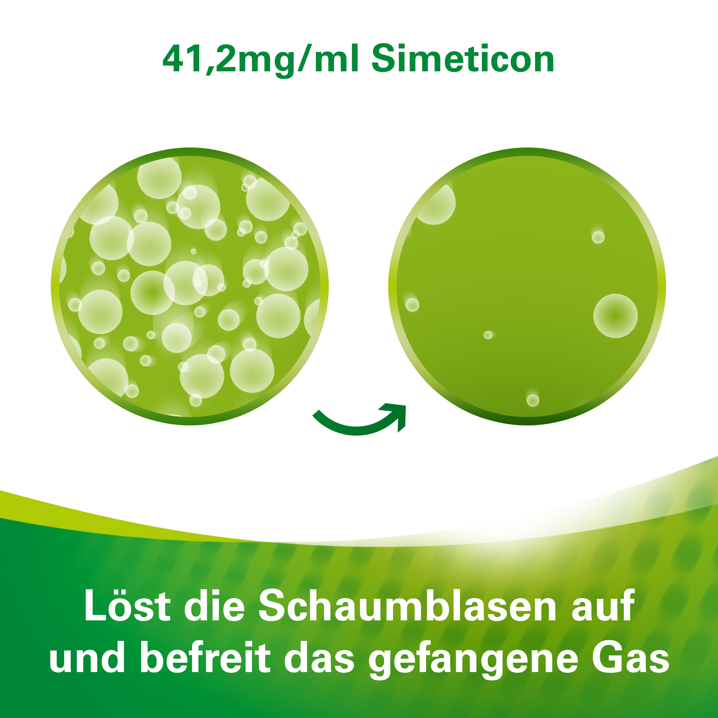 Der Wirkstoff hilft gegen Blähungen. Diese werden durch aufgestaute Gase im Magen-Darm-Trakt verursacht, die in Form eines feinen Schaums vorliegen. Der Wirkstoff fördert den Abgang der Gase, indem er diesen Schaum zerstört.