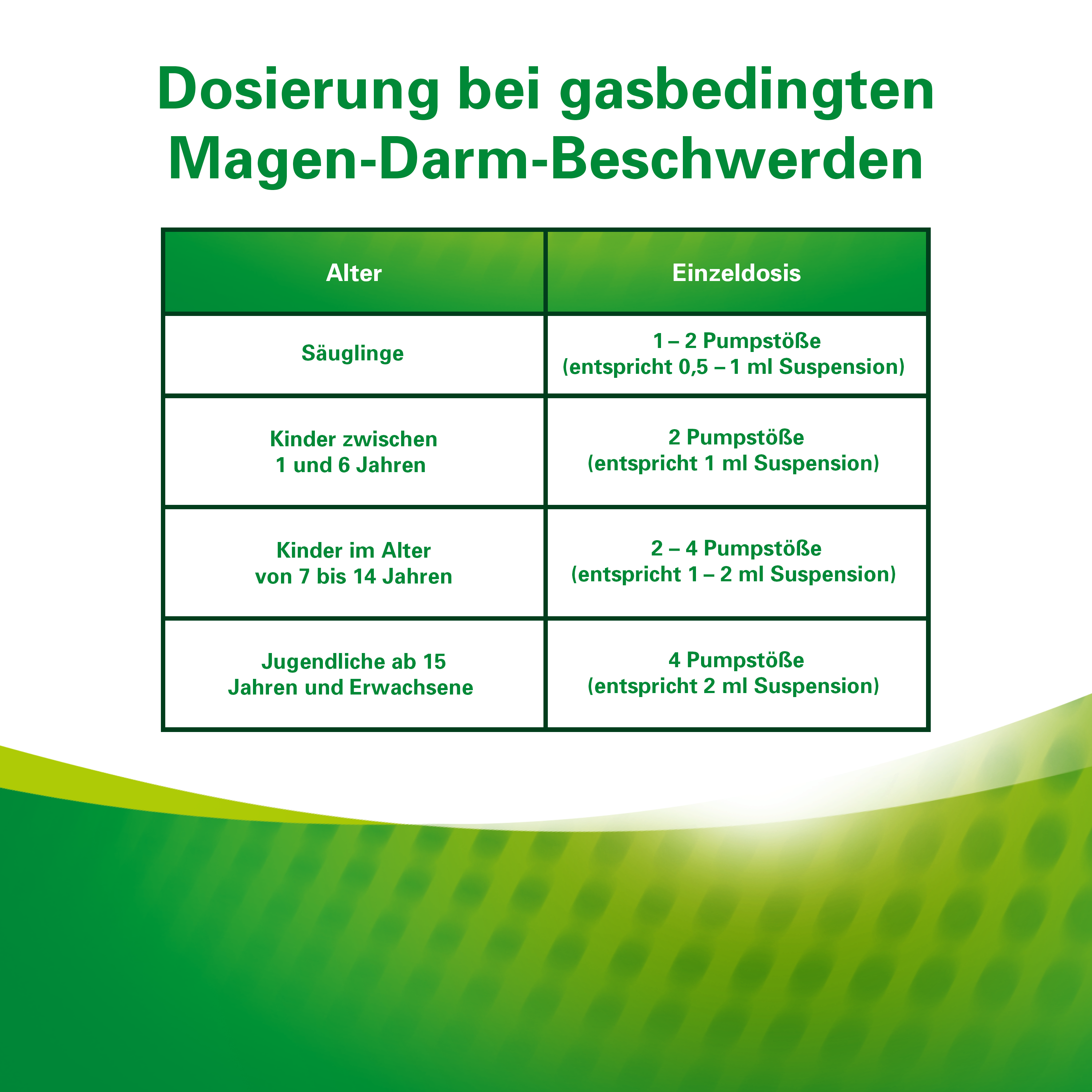 | Kinder von 7-14 Jahren | 2-4 Pumpstöße | 3-5 mal täglich | zu der Mahlzeit, evtl. vor dem Schlafengehen |