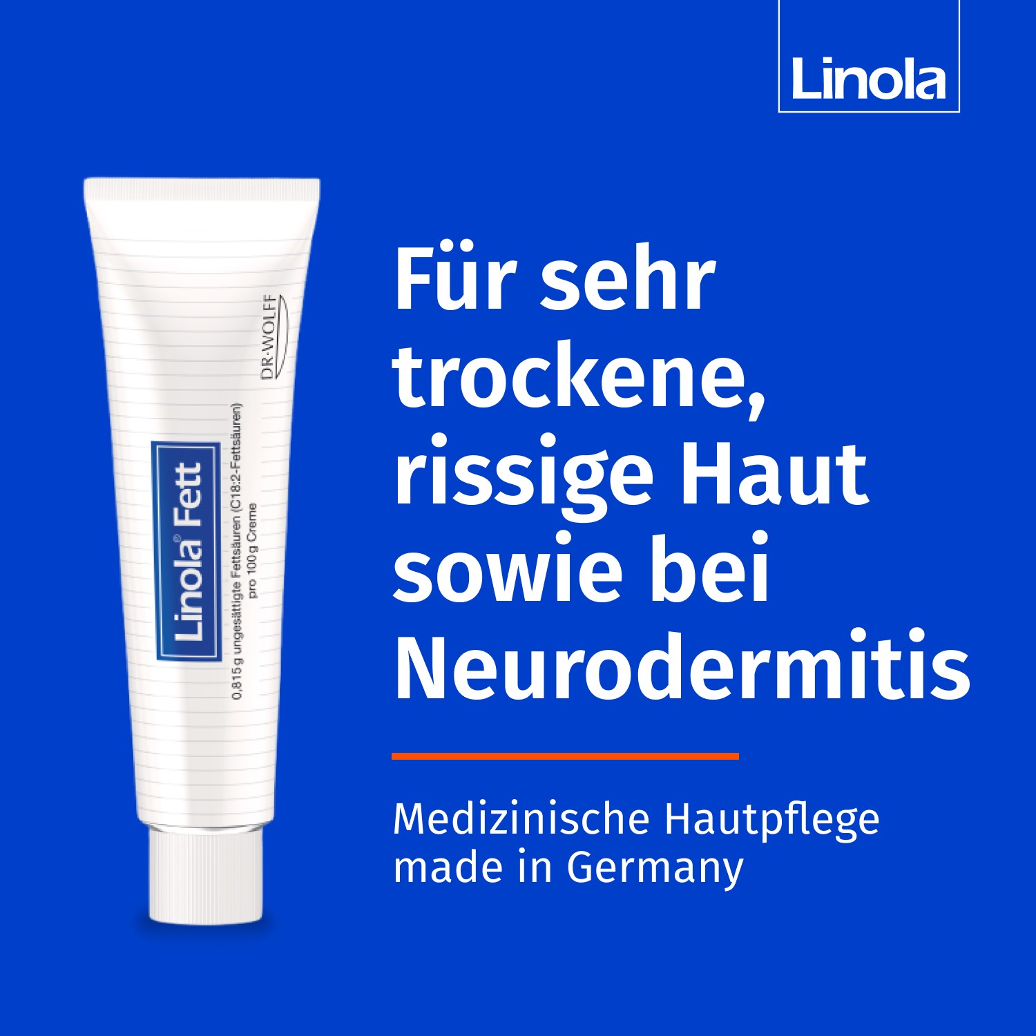 Linola Fett unterstützt die Behandlung der Neurodermitis im chronischen Stadium mit sehr trockener und juckender Haut. Linola Fett ist die ideale Fettcreme zur Behandlung sehr trockener, rissiger oder juckender Haut, wie sie z. B. bei Neurodermitis vorkommt. Linola Fett enthält als Wirkstoff ungesättigte Fettsäuren (u.a. Linolsäure), die für die Barrierefunktion der gesunden Haut notwendig sind.
