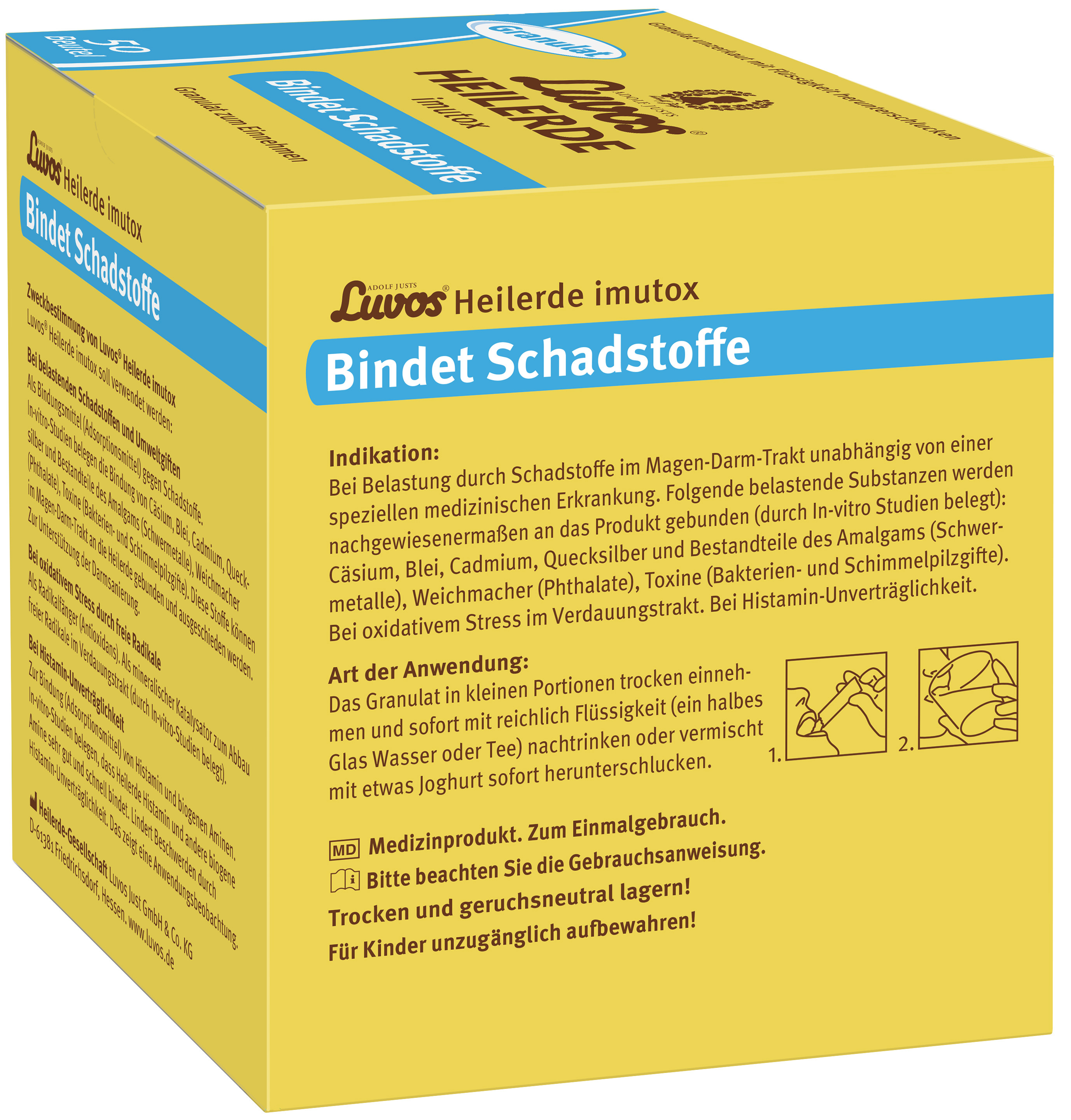 Adolf Justs Luvos® Heilerde imutox Pulver ist ein Medizinprodukt, das zur Unterstützung des Organismus bei der Körperentgiftung, Darmsanierung, Entschlackung sowie Entlastung der Leber und Niere durch Bindung von Schadstoffen und Umweltgiften aus der Nahrung verwendet wird. Beispielsweise werden gebunden: belastende Substanzen (radioaktives Cäsium), Schwermetalle (Blei, Cadmium, Quecksilber und Bestandteile des Amalgams), Weichmacher (Phthalate), Toxine (Bakterien- und Schimmelpilzgifte).