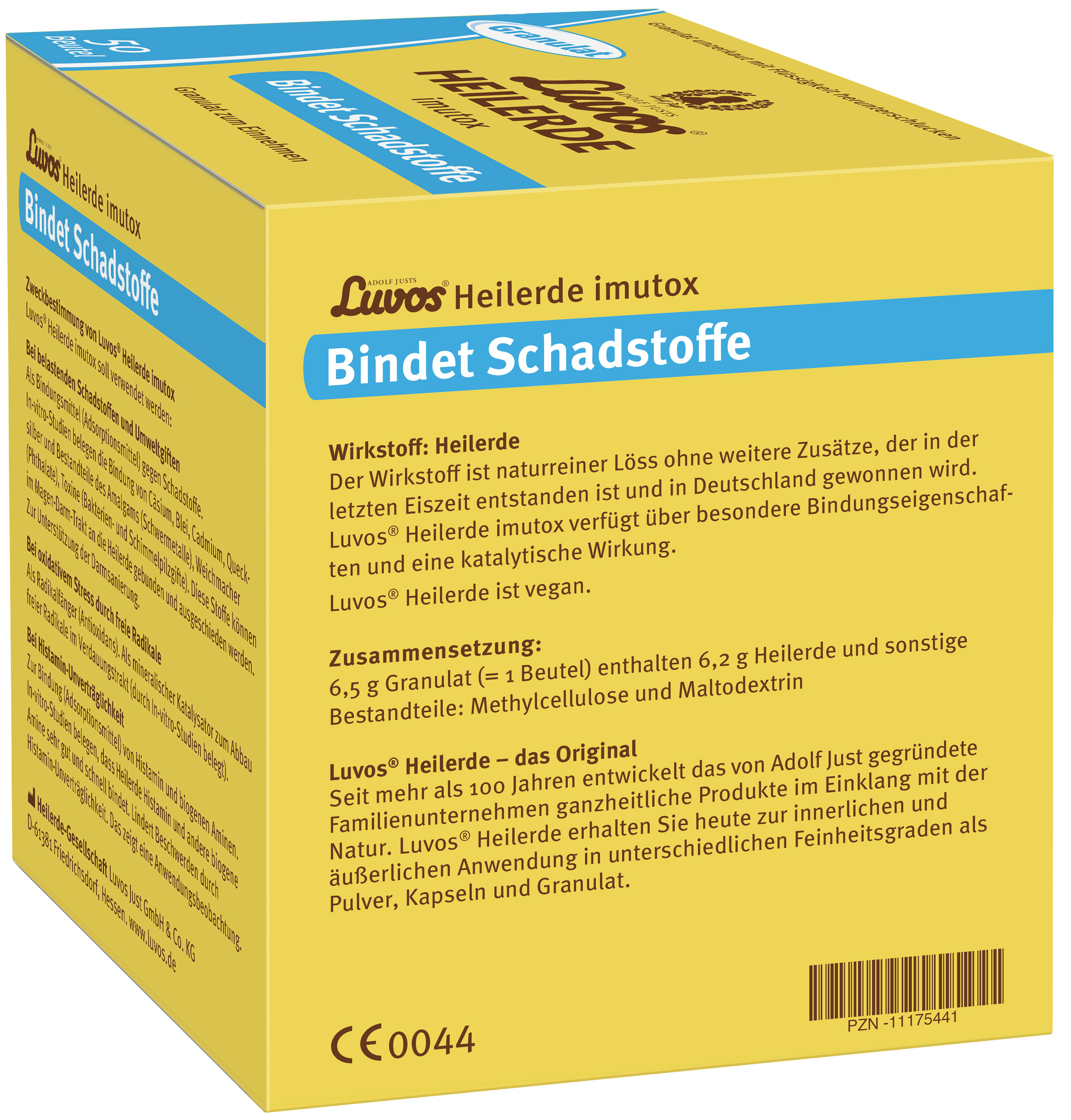 Luvos-Heilerde ist naturreiner Löss ohne weitere Zusätze, der in der letzten Eiszeit entstanden ist und in Deutschland gewonnen wird. Durch natürliche Windsichtung und spezifische Selektion besitzt Luvos-Heilerde imutox besondere Bindungseigenschaften und eine katalytische Wirkung. Entsprechend der gewünschten Wirkung haben die Luvos-Heilerde Produkte anwendungsspezifische Feinheitsgrade. Luvos-Heilerde enthält keine Zusatzstoffe und ist auch für Veganer geeignet.