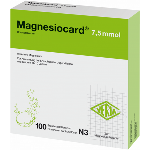 Magnesiocard® 7,5 mmol bewährt sich seit vielen Jahren als Arzneimittel mit höchsten Qualitätsstandards in der Therapie von Magnesiummangelzuständen. Die hochwertige Brausetablette schmeckt frisch nach Citrus und kann einfach in einem Glas Wasser aufgelöst werden. So wird auch die tägliche Flüssigkeitsaufnahme unterstützt. Durch die moderate Dosierung von Magnesiocard® 7,5 mmol ist es individuell gut dosierbar und kann ganz nach Bedarf über den Tag verteilt getrunken werden. Dies erhöht die Bioverfügbarkeit von Magnesium, da kleine Mengen effektiver aufgenommen werden können als große Einmal-Dosen. Magnesiocard® 7,5 mmol enthält zudem organisches Magnesiumaspartat-Hydrochlorid für eine gute Aufnahme im Körper.