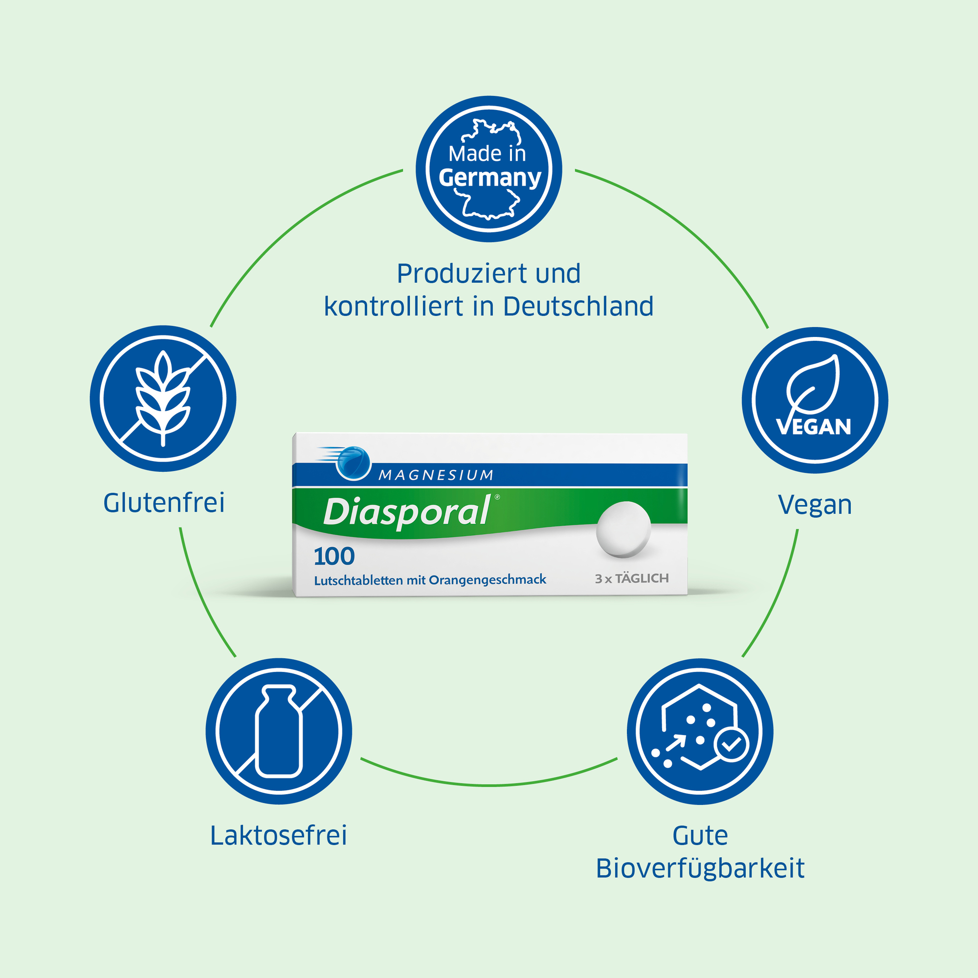 Magnesium-Diasporal® 100, Lutschtabletten (Wirkstoff: Magnesiumcitrat) Anwendungsgebiet: Nachgewiesener Magnesiummangel, wenn er Ursache für Störungen der Muskeltätigkeit (Neuromuskuläre Störungen, Wadenkrämpfe) ist. Enthält Sucrose (Zucker). Zu Risiken und Nebenwirkungen lesen Sie die Packungsbeilage und fragen Sie Ihren Arzt oder Apotheker. Protina Pharm. GmbH, D-85737 Ismaning