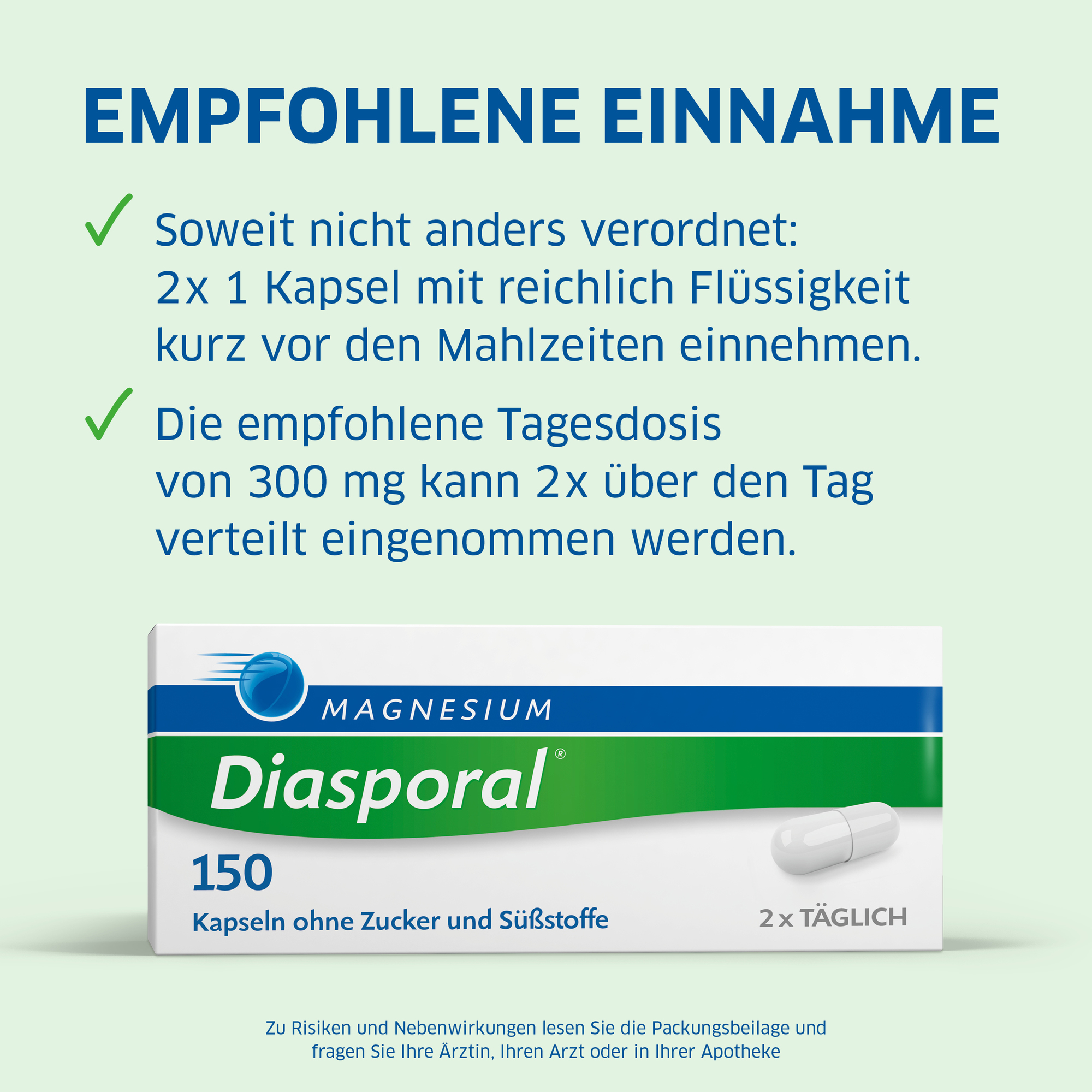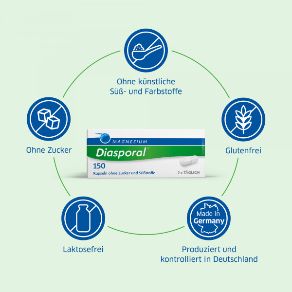Magnesium-Diasporal® 150, Kapseln (Wirkstoff: Magnesiumoxid) Anwendungsgebiet: Magnesiummangel, wenn er Ursache für Störungen der Muskeltätigkeit (Neuromuskuläre Störungen, Wadenkrämpfe) ist. Zu Risiken und Nebenwirkungen lesen Sie die Packungsbeilage und fragen Sie Ihren Arzt oder Apotheker. Protina Pharm. GmbH, D-85737 D-Ismaning