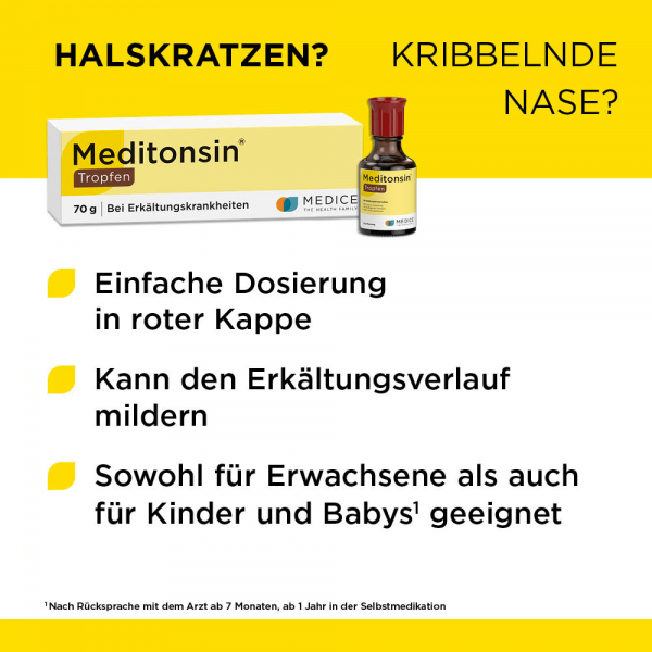 Meditonsin® eignet sich schon für Kinder ab 1 Jahr in der Selbstmedikation. Bei Säuglingen ab 7 Monaten kann Meditonsin® nach Rücksprache mit dem Arzt eingesetzt werden, denn Meditonsin® ist verträglich und schont den Organismus.