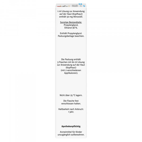 1 ml Lösung zur Anwendung auf der Haut (Kopfhaut) enthält 50 mg Minoxidil.