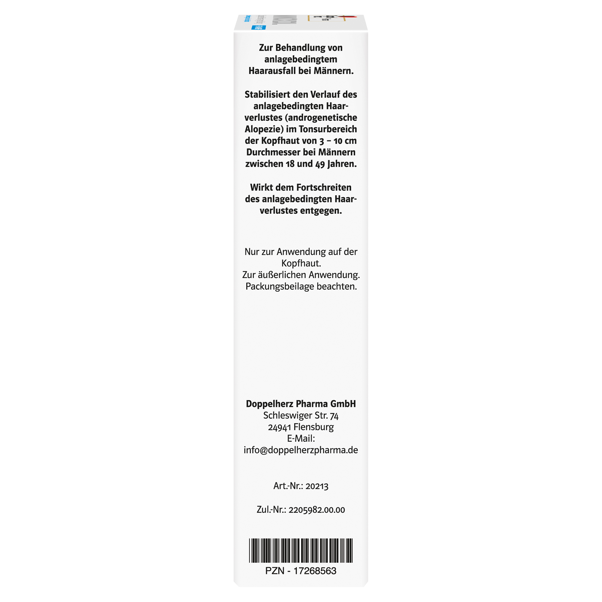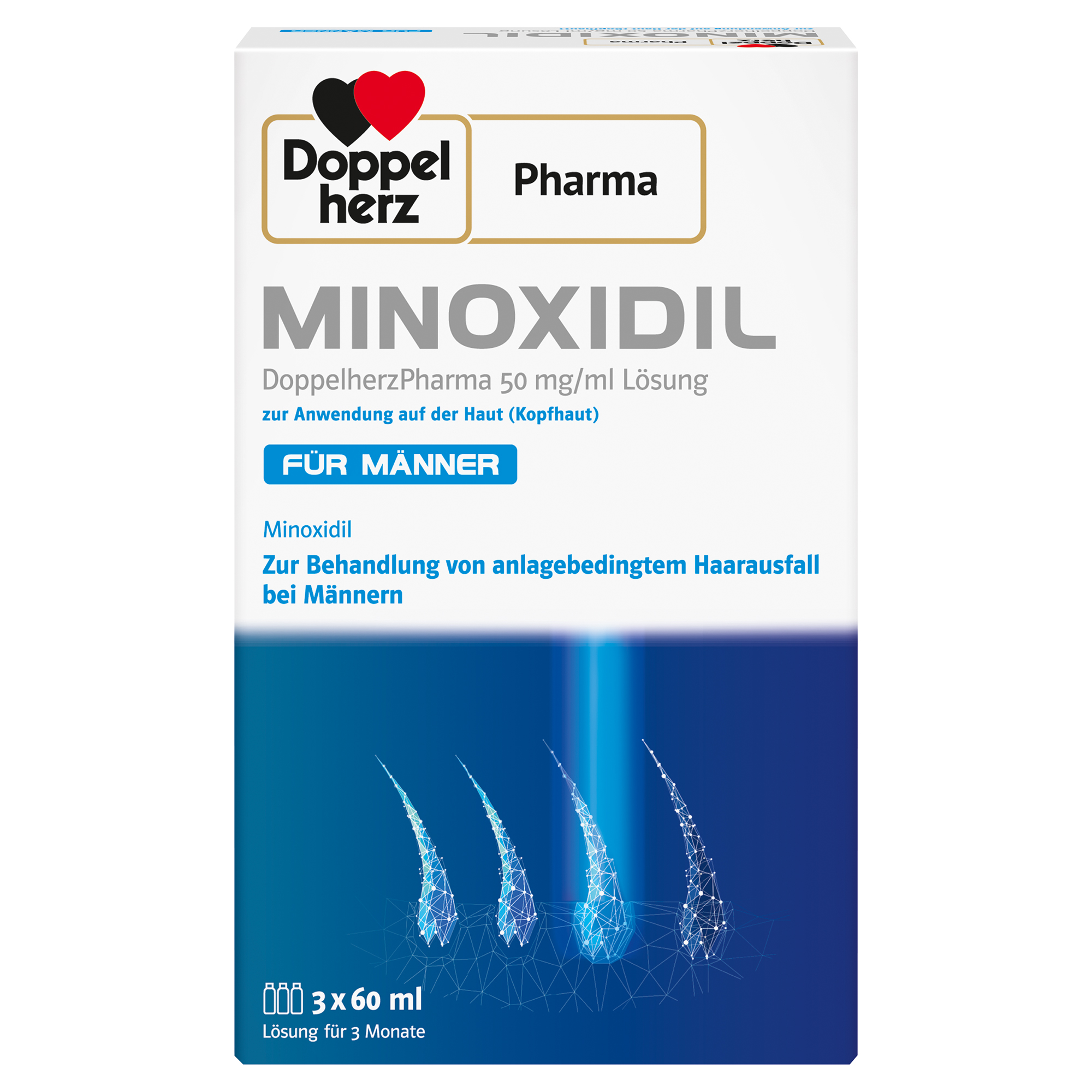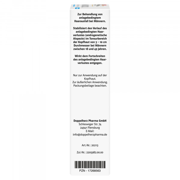 MINOXIDIL DoppelherzPharma enthält den Wirkstoff Minoxidil und ist ein Arzneimittel zur Behandlung des Haarausfalls von Männern (androgenetische Alopezie). MINOXIDIL DoppelherzPharma stabilisiert den Verlauf des anlagebedingten Haarverlustes (androgenetische Alopezie) im Tonsurbereich der Kopfhaut von 3 – 10 cm Durchmesser bei erwachsenen Männern zwischen 18 und 49 Jahren. Die Behandlung kann so dem Fortschreiten des anlagebedingten Haarverlustes entgegenwirken. Beginn und Ausmaß dieser Wirkung können individuell unterschiedlich sein und sind nicht vorhersagbar.
