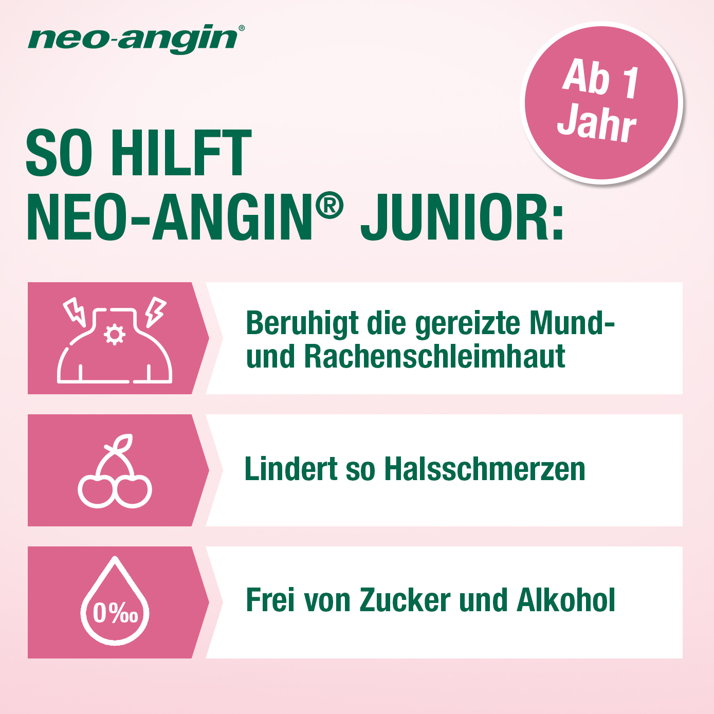 Hilfe bei Halsschmerzen für die Allerkleinsten: Der neo-angin® junior Halsschmerzsaft schützt und beruhigt die Schleimhäute und lindert die Schmerzen im Hals. Er ist frei von Zucker und Alkohol und schmeckt lecker nach Kirsche.