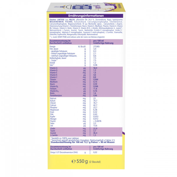 Laktose (aus Milch), pflanzliche Öle 24,4% (Sonnenblume, Raps), hydrolysiertes Molkeneiweiß, Fischöl, Kaliumchlorid, Calciumglycerophosphat, Cholinbitartrat, Calciumorthophosphate, Magnesiumchlorid, Öl aus Mortierella alpina, Calciumchlorid, L-Arginin, Vitaminmischung (Vitamin C, Pantothensäure, Niacin, Vitamin E, Riboflavin, Thiamin, Vitamin A, Vitamin B6, Folsäure, Vitamin K, Biotin, Vitamin D, Vitamin B12), L-Histidin, Milchsäurebakterien (L. reuteri)*, Natriumchlorid, L-Tyrosin, Inositol, Taurin, Nukleotide (Cytidin-5´-monophosphat, Uridin-5´-monophosphat, Adenosin-5´-monophosphat, Guanosin-5´-monophosphat), L-Carnitin, Eisensulfat, Zinksulfat, Kupfersulfat, Mangansulfat, Kaliumjodid, Natriumselenat.