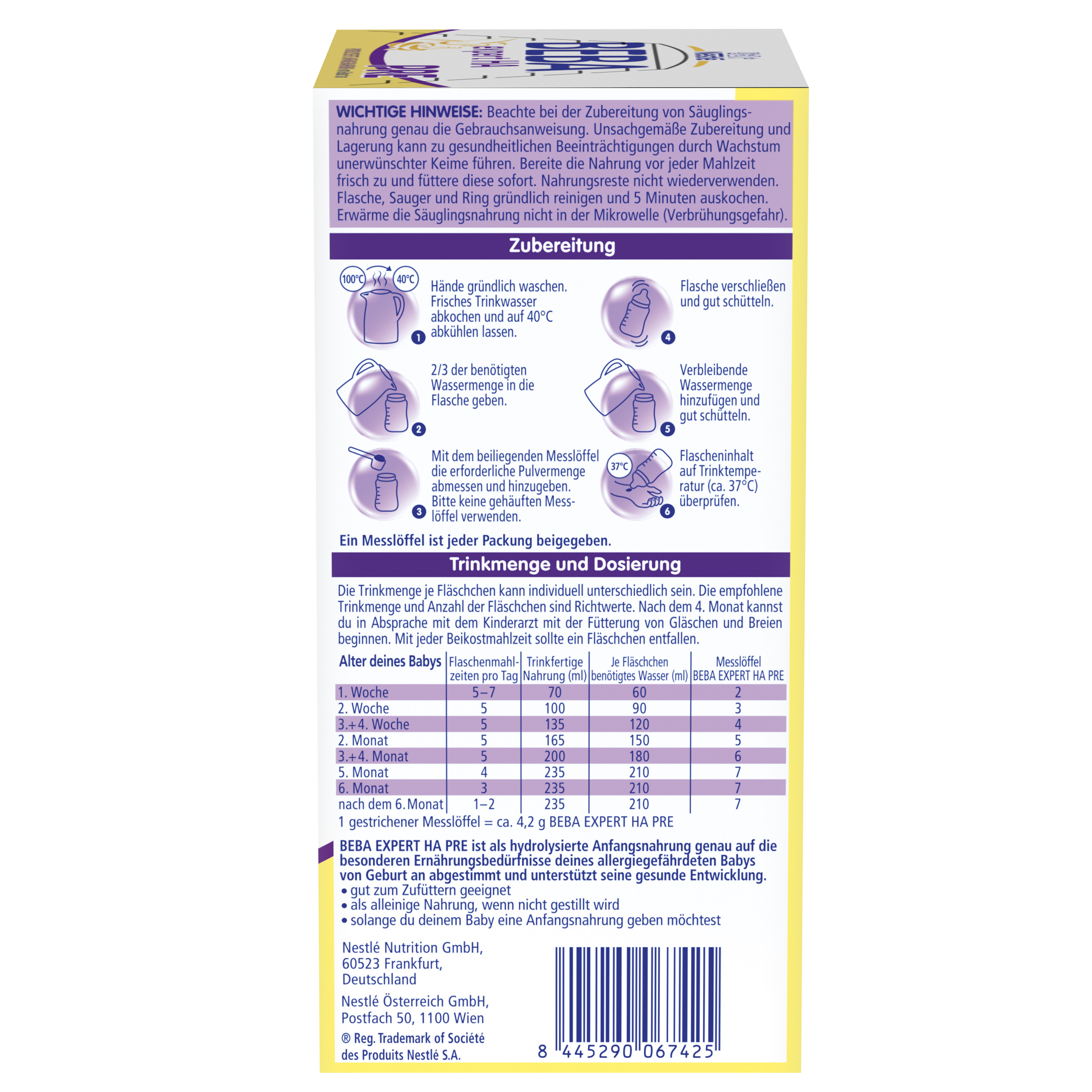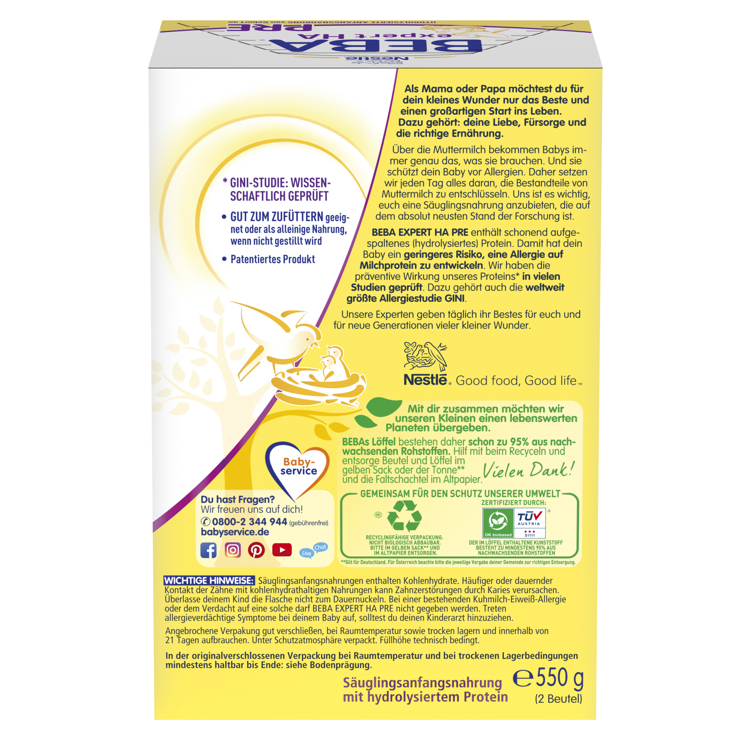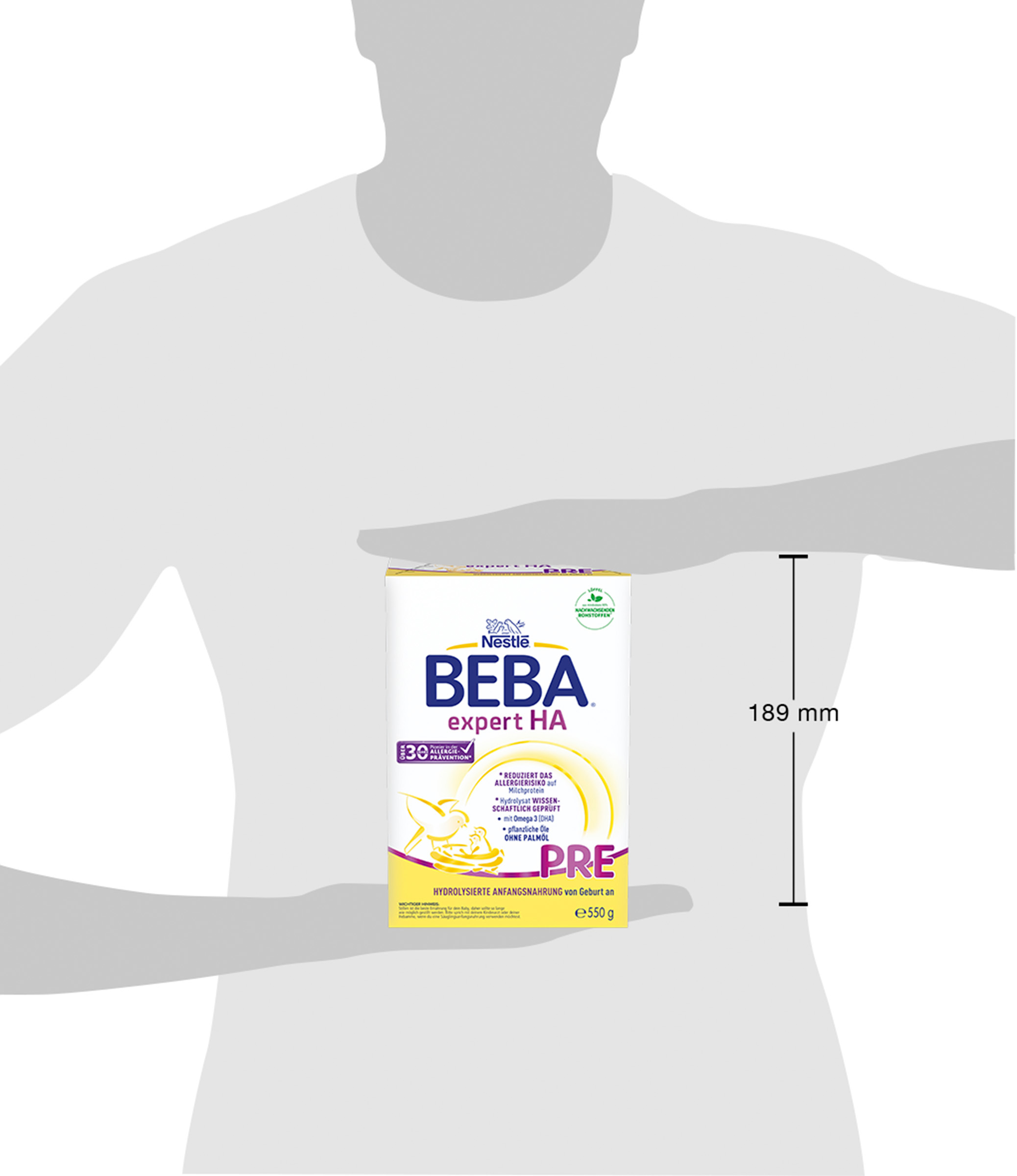 Stillen ist die beste Ernährung für Ihr Baby. Sprechen Sie bitte mit Ihrem Kinderarzt oder Ihrer Hebamme, wenn Sie eine Säuglingsnahrung verwenden wollen. Das Produkt bitte nicht verwenden bei Kuhmilcheiweiß-Allergie bzw. Unverträglichkeit, Galaktosämie, kongenitaler Laktose-Intoleranz, Galaktokinasemangel, Glukose- und Galaktose-Malabsorption, Maltose-Unverträglichkeit. Säuglingsanfangsnahrungen enthalten Kohlenhydrate. Häufiger oder dauernder Kontakt der Zähne mit kohlenhydrathaltigen Nahrungen kann Zahnzerstörungen durch Karies verursachen. Überlassen Sie Ihrem Kind die Flasche nicht zum Dauernuckeln. Bei einer bestehenden Kuhmilchallergie oder dem Verdacht auf eine solche darf BEBA EXPERT HA PRE nicht gegeben werden. Treten allergieverdächtige Symptome bei deinem Baby auf, solltest du deinen Kinderarzt hinzuziehen.