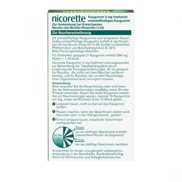 Das nicorette® Kaugummi freshmint unterstützt auf dem Weg in die Rauchfreiheit. Das aktive Kauen des Nikotinkaugummis setzt Nikotin frei, welches über die Mundschleimhaut in die Blutbahn gelangt und den Nikotinspiegel im Blut erhöht. Dadurch wird nicht nur Rauchverlangen, sondern auch typische Entzugserscheinungen wie innere Unruhe oder gesteigerter Appetit gelindert. Außerdem kann das aktive Kauen vom Rauchverlangen ablenken. Die nicorette® Kaugummis sind nicht nur zuckerfrei, sondern haben auch einen frischen Minzgeschmack und erfrischen den Atem. Mit den enthaltenen 4 mg Nikotin eignen sich diese Kaugummis für Personen, die bislang mehr als 20 Zigaretten pro Tag rauchen. Wenn weniger als 20 Zigaretten geraucht werden, sollten die niedriger dosierten Kaugummis mit 2 mg Nikotin verwendet werden. Die nicorette® Kaugummis sind auch in den Geschmacksrichtungen freshfruit und whitemint erhältlich
