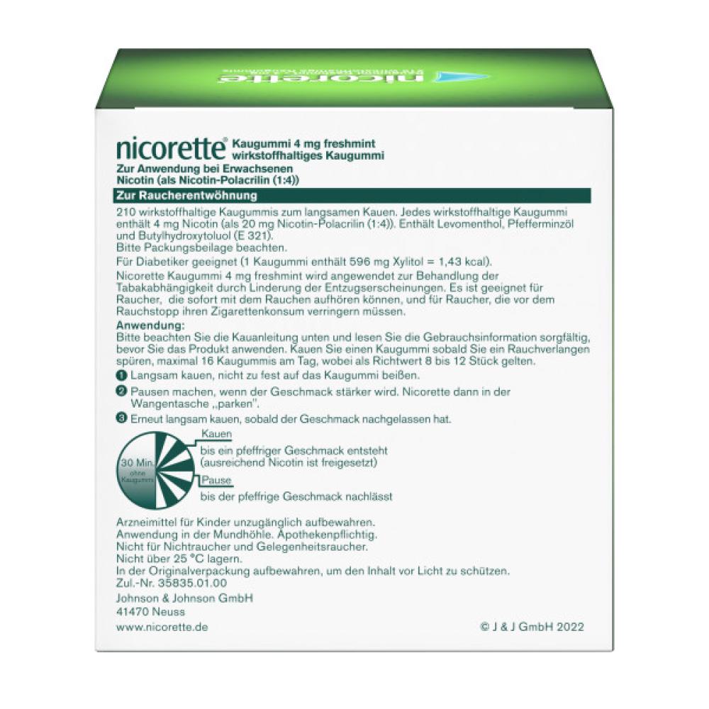 Die nicorette® Kaugummis sind nicht nur zuckerfrei, sondern haben auch einen frischen Minzgeschmack. Mit den enthaltenen 4 mg Nikotin eignen sich diese Kaugummis für Personen, die bislang mehr als 20 Zigaretten pro Tag rauchen. Wenn bis zu 20 Zigaretten geraucht werden, sollten die niedriger dosierten Kaugummis mit 2 mg Nikotin verwendet werden. Die nicorette® Kaugummis sind auch in den Geschmacksrichtungen freshfruit und whitemint erhältlich.