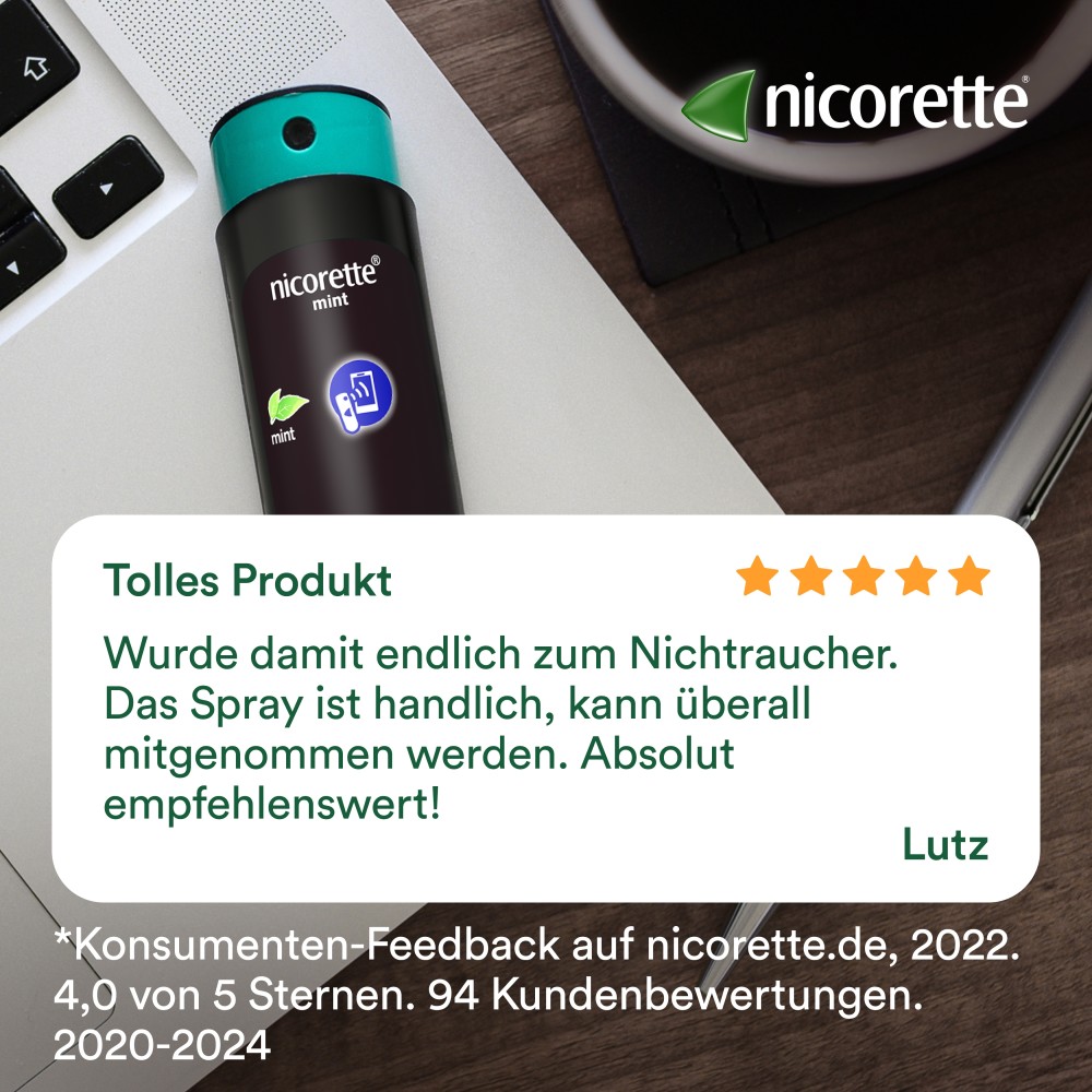 - Rauchen aufhören: nicorette® mint Spray lindert Rauchverlangen in nur 30 Sekunden mit zwei Sprühstößen, klinisch belegt! Jetzt mit motivierender Tracking-App „nicorette® Nichtraucher“ verbinden.