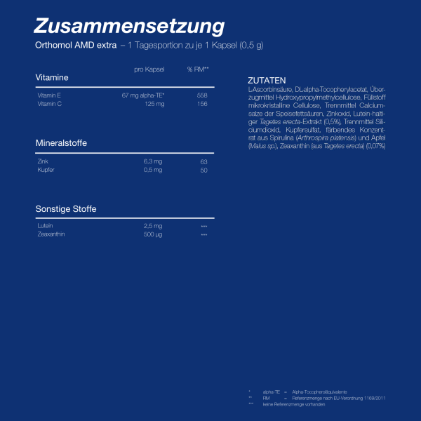 Orthomol AMD extra ist ein Nahrungsergänzungsmittel mit Vitamin E, Vitamin C, Zink, Kupfer, Lutein und Zeaxanthin. Zink trägt zur Erhaltung normaler Sehkraft bei. Vitamin C und Kupfer tragen zu einer normalen Funktion des Nervensystems (u.a. Sehnerv) bei. Vitamin C, Vitamin E, Kupfer und Zink tragen zum Schutz der Zellen vor oxidativem Stress bei.