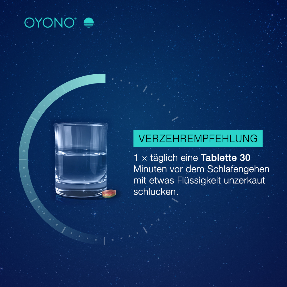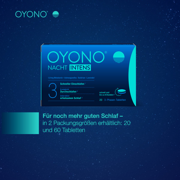 • Das Nahrungsergänzungsmittel OYONO® NACHT INTENS ist in der Packungsgröße 20 und 60 Tabletten erhältlich