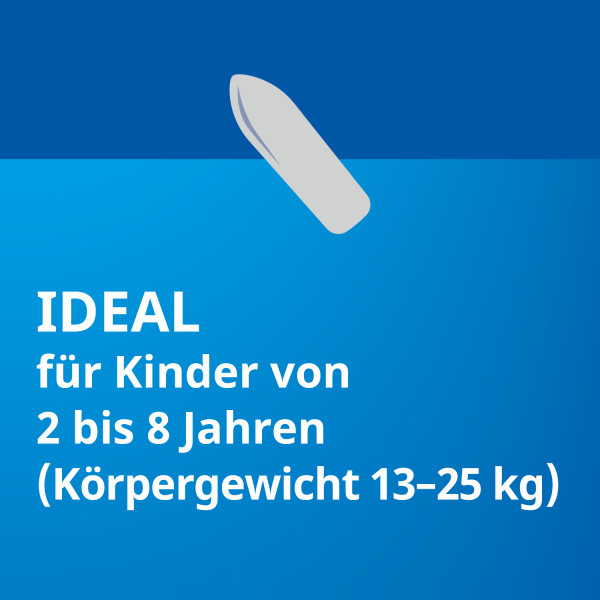 | Kleinkinder von 2-4 Jahren mit 13-16 kg Körpergewicht | 1 Zäpfchen | 1-3 mal täglich | im Abstand von 6 Stunden |