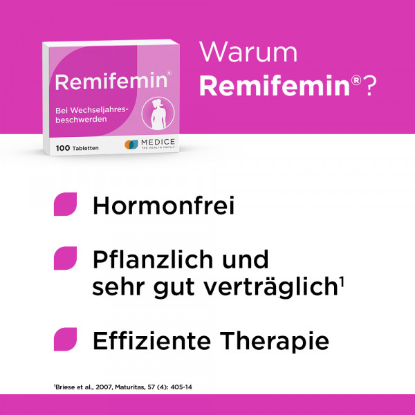 Auch im weiteren Verlauf der Wechseljahre, wenn die Beschwerden weitestgehend unter Kontrolle sind bzw. wieder abklingen, ist das sanfte und zuverlässige Remifemin die richtige Lösung.
