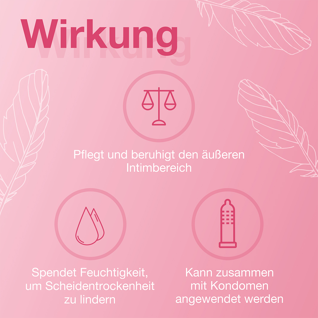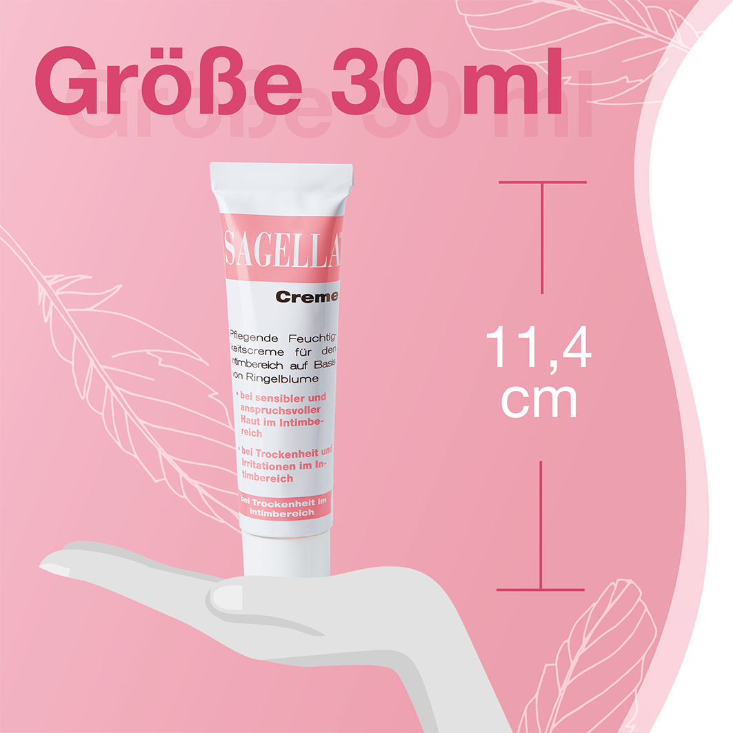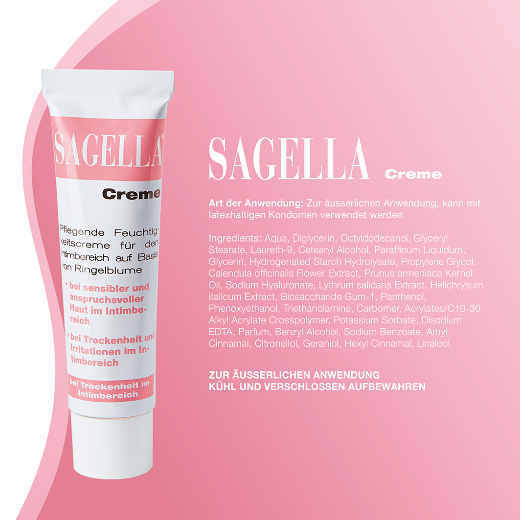 SAGELLA Creme versorgt die anspruchsvolle und sensible Haut im Intimbereich mit Feuchtigkeit und kann bei beanspruchter oder zu Trockenheit neigender Haut Juckreiz, Brennen und Irritationen lindern. SAGELLA Creme enthält neben anderen natürlichen Inhaltsstoffen auch Hyaluronsäure, die natürlicherweise im Bindegewebe vorkommt und hilft, die Elastizität und Geschmeidigkeit der Haut zu erhalten. Calendula, also der Extrakt der Ringelblume, kann helfen, Juckreiz und Rötungen zu lindern, die häufig zu den Begleiterscheinungen von Trockenheit und Volumenabnahme der Schleimhäute gehören. Helichrysum (Strohblume)- und Salicaria (Blutweiderich)-Extrakte sind für ihre antibakterielle und wundheilende Wirkung in der Naturheilkunde bekannt.