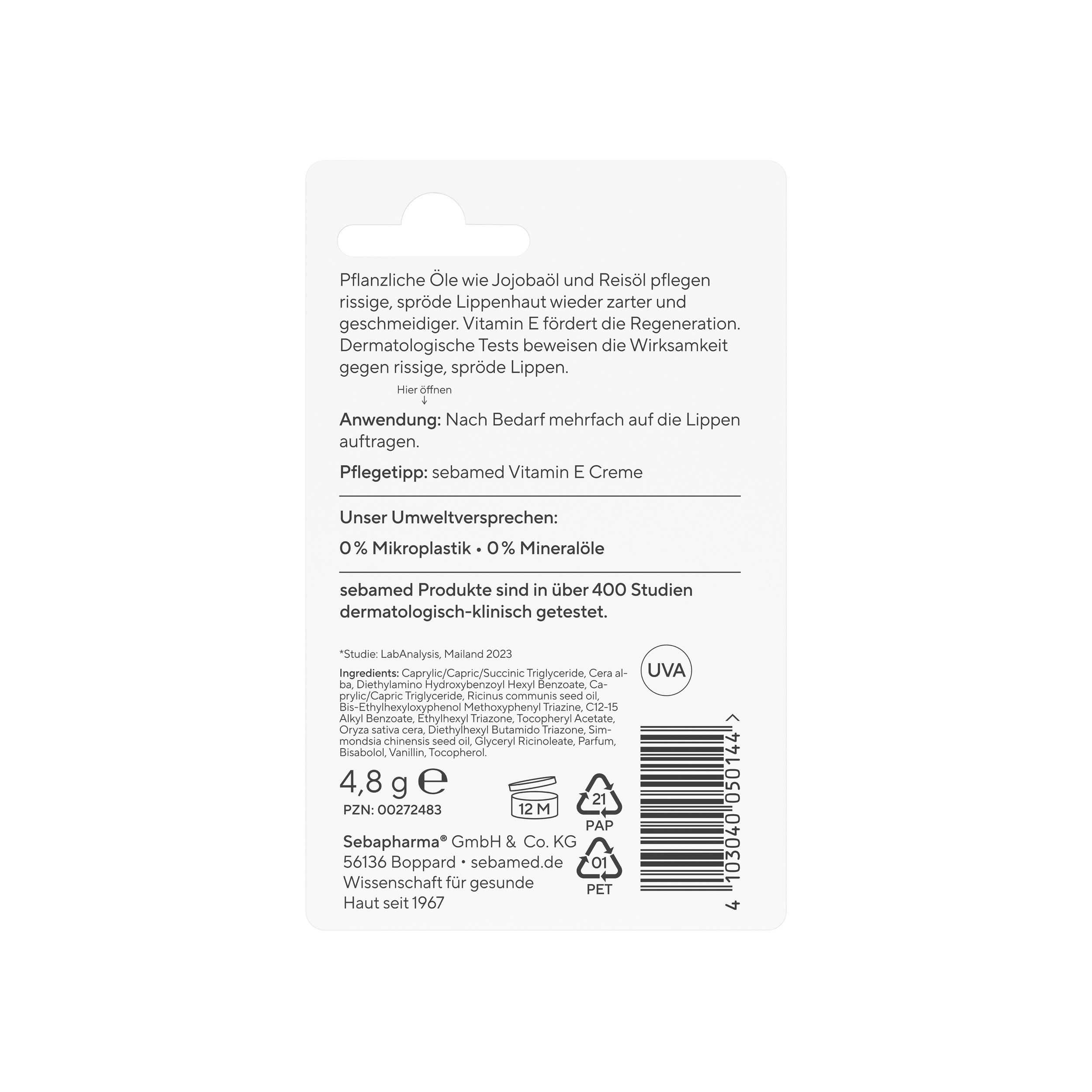 HILFT GEGEN SPRÖDE UND RISSIGE LIPPEN: Pflanzliche Öle wie Jojobaöl und Reisöl pflegen rissige, spröde Lippenhaut wieder zarter und geschmeidiger. Vitamin E fördert die Regeneration. Dermatologische Tests beweisen die Wirksamkeit gegen rissige und spröde Lippen