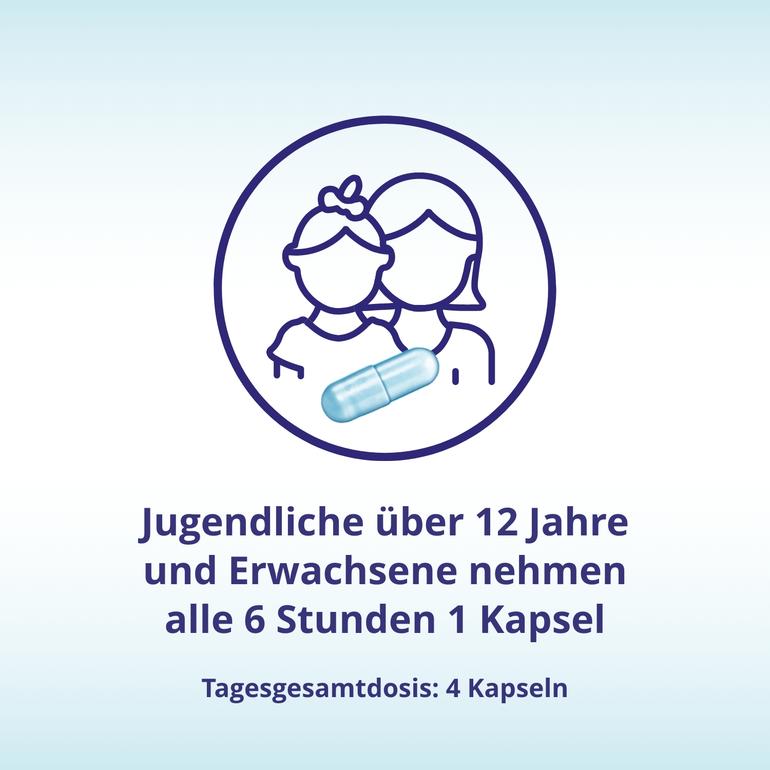 | Jugendliche ab 12 Jahren und Erwachsene | 1 Kapsel | 1-4 mal täglich | im Abstand von 6 Stunden, unabhängig von der Mahlzeit |