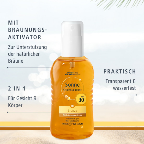 medipharma cosmetics Sonne Schutz & Bräune LSF 30 Pumpspray - Ultraleichtes Sonnenspray für Gesicht und Körper mit Pro-Melanin-Extrakt zur Intensivierung der natürlichen Bräune.