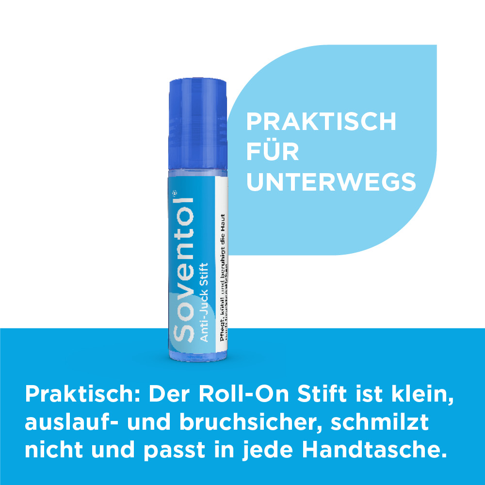 Bei Mückenstichen hilft der Soventol® Anti-Juck Stift: Er kühlt wunderbar und pflegt sanft. Praktisch: Der Roll-On Stift ist klein, auslauf- und bruchsicher und passt in jede Handtasche ? der ideale Begleiter für unterwegs! Ebenfalls von Vorteil: Der Soventol® Anti-Juck Stift ist sehr gut verträglich und damit für die ganze Familie geeignet.
