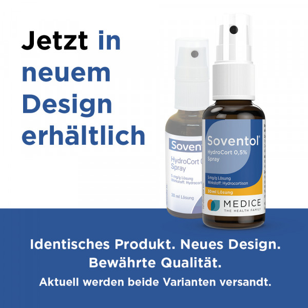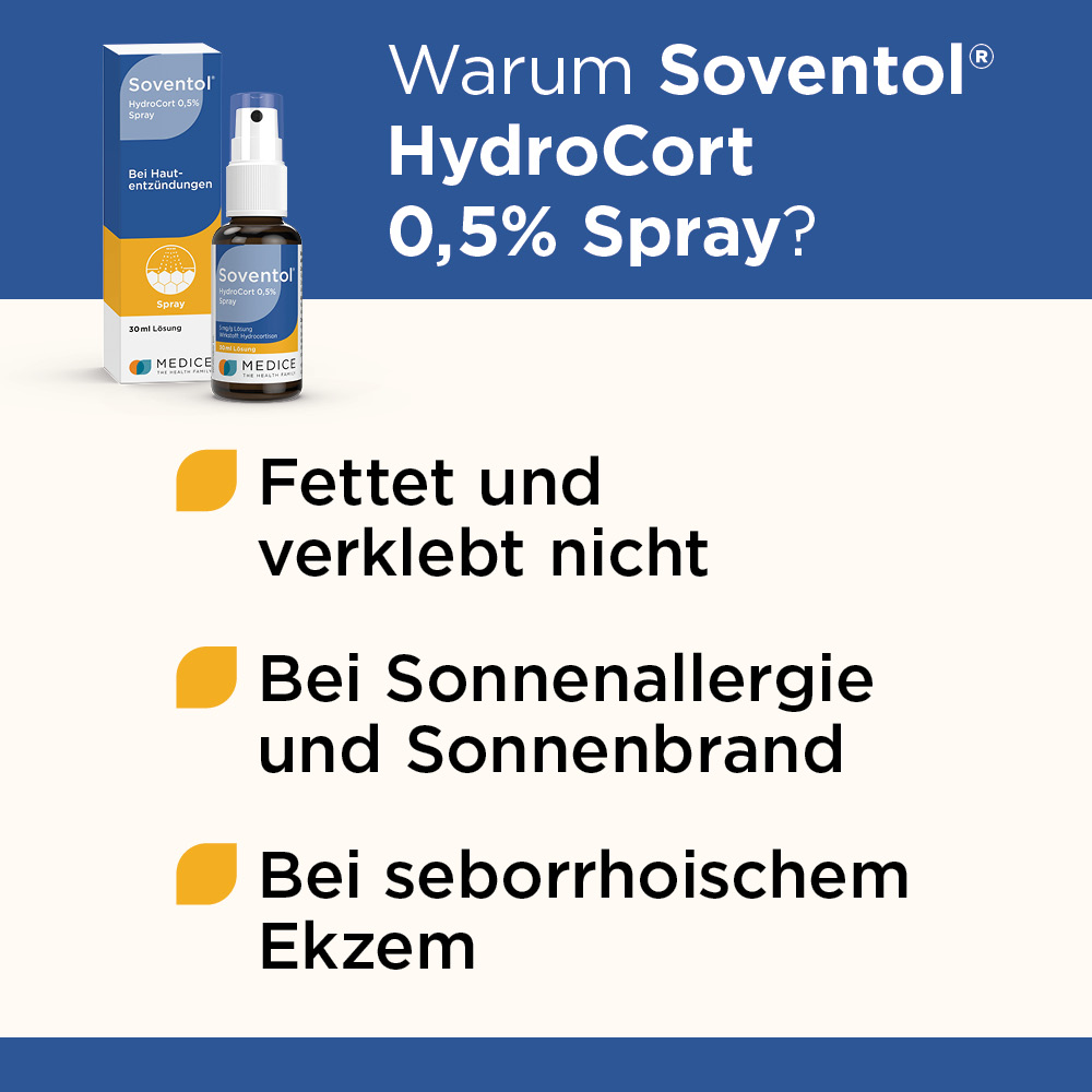 Soventol® HydroCort 0,5% Spray 5 mg/g Lösung. Anwend.: Zur Linder. v. nicht infiz. leichten entzündl., allerg. o. juck. Hauterkr., d. auf eine symptom. Behandl. m. schwach wirks. Glucocorticosteroiden ansprechen. Eignet sich vorzugsweise zur Anwend. auf normaler od. fettiger Haut. Warnhinweis: Enthält Propylenglycol. Zu Risiken und Nebenwirkungen lesen Sie die Packungsbeilage und fragen Sie Ihren Arzt oder Apotheker; 07/2017.