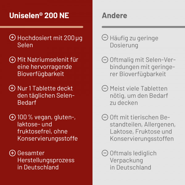 Selen ist ein für die menschliche Gesundheit unentbehrliches Spurenelement, das der Organismus jedoch nicht selbst bilden kann. Die biologische Hauptfunktion von Selen besteht, als Bestandteil körpereigener Enzyme, im Zellschutz. In diesem Zusammenhang ist das bedeutenoste selenhaltige Schutzenzym die Glutathionperoxidase, die den Auswirkungen der Freien Radikalen entgegenwirkt. Freie Radikale (=aggressive Teilchen, die Körperzellen chemisch verändern) entstehen, wenn der Organismus belastenden Umwelteinflüssen, wie z. B. erhöhter UV-Strahlung und Abgasen sowie starken körperlichen Beanspruchungen ausgesetzt ist. Die Europäische Behörde für Lebensmittelsicherheit (EFSA) hat die Bedeutung von Selen für ein gut funktionierendes Immunsystem und eine gesunde Schilddrüsenfunktion anerkannt. Ebenso den hohen Stellenwert von Selen für den antioxidativen Schutz der Zellbestandteile sowie der Reifung der Samenzellen. ln Deutschland sind nicht selten Ernährungssituationen anzutreffen, unter denen eine ausreichende Selenversorgung nicht gewährleistet ist. Gründe dafür können eine unausgewogene Ernährung sein oder der Umstand, dass unsere Nahrungsmittel zum Teil selenarm sind (ausgelaugte Ackerböden) oder dass in bestimmten Belastungssituationen (wie z.B. Stress der Selenbedarf des Körpers erhöht ist. Uniselen 100 NE enthält das Spurenelement Selen in Form von Natriumselenit. Aus dieser Verbindung kann das Selen besonders schnell in selenhaltige Enzyme eingebaut und für den Körper verfügbar gemacht werden.