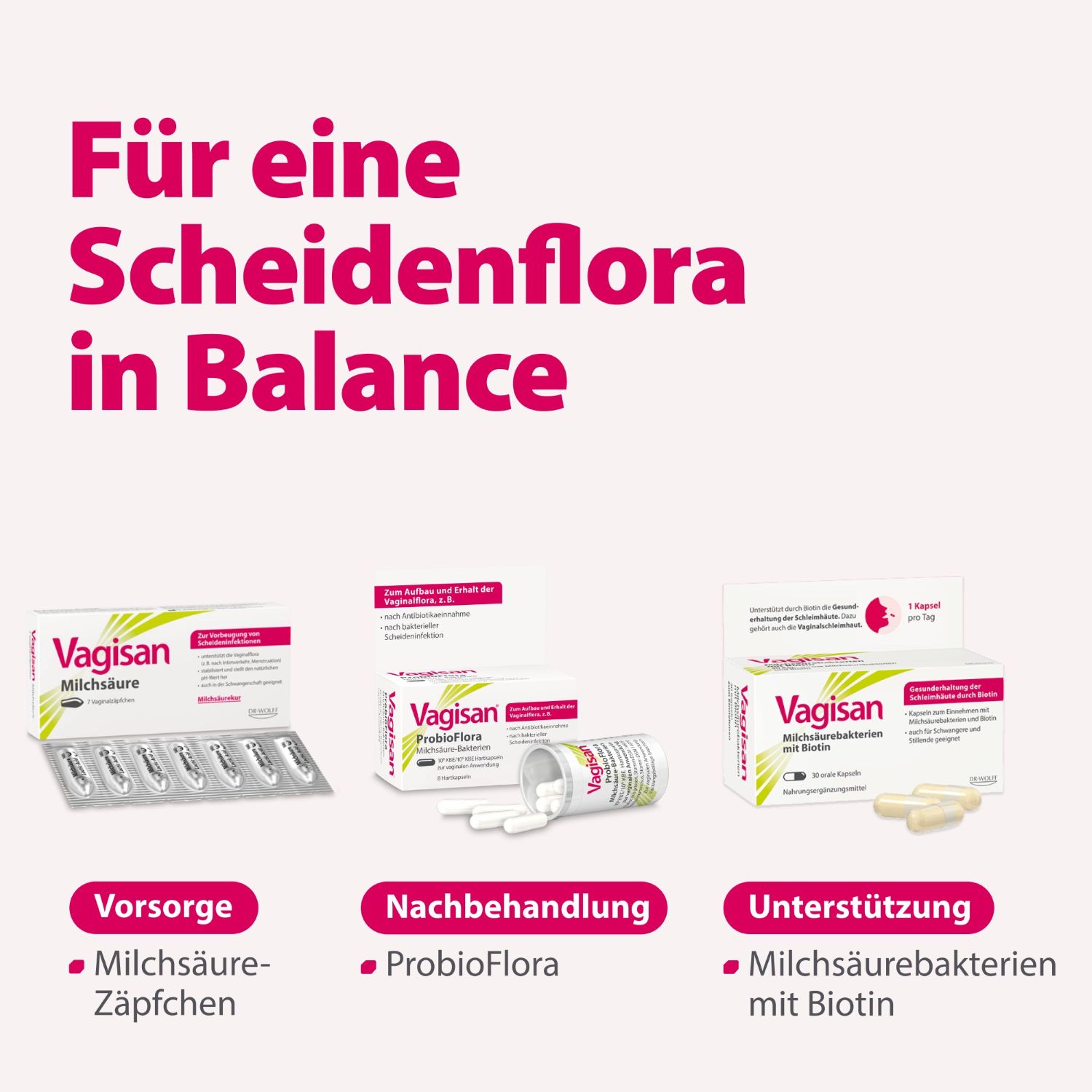 Frauen, die zu wiederholten Scheideninfektionen neigen (z. B. chronische bakterielle Vaginose), können durch das Zuführen von Milchsäure ein gesundes und damit abwehrstarkes Scheidenmilieu wiederherstellen bzw. aufrechterhalten. Sie können mit der Anwendung von Vagisan Milchsäure selbst einen Beitrag zur Prävention leisten: Schnelle Ansäuerung der Scheide, Stabilisierung eines physiologischen pH-Wertes, bakterielle Scheideninfektion vorbeugen. Vagisan Milchsäure kann vorbeugend bei Neigung zu wiederholter Scheidenentzündung und in Ergänzung zu einer medikamentösen Behandlung (orale Einnahme von Antibiotika) bei einer Scheideninfektion eingesetzt werden. Eine Scheidenentzündung entsteht in der Regel auf Grund einer Disbalance in der Scheidenflora, verursacht z. B. durch häufige Antibiotika-Einnahme, Hormonschwankungen, Abwehrschwäche etc. In der gesunden Scheide sorgt ein saures Milieu für einen natürlichen Infektionsschutz. Die Ansäuerung des Scheidenmilieus mit Milchsäure unterstützt das Wachstum der Scheiden-typischen „guten“ Laktobazillen (Milchsäurebakterien), die im Wesentlichen eine gesunde Vaginalflora ausmachen. Zugleich wird durch die Ansäuerung mit Milchsäure die Vermehrung der „krankmachenden“ Erreger ausgebremst. Milchsäure kann deshalb zur Vorbeugung bei Frauen mit einer Neigung zu wiederkehrenden Scheideninfektionen (z. B. bakterielle Vaginose) eingesetzt werden. Vagisan Milchsäure sind Vaginalzäpfchen, die ein Milchsäure-Natriumlactat-Gemisch enthalten. Sie werden zur Erhaltung und Wiederherstellung eines natürlichen Säurewertes (pH-Wert) in der Scheide angewandt. Dieser liegt normalerweise bei 3,8 bis 4,4. Mit Vagisan Milchsäure Zäpfchen erfolgt eine schnelle und effektive Ansäuerung des Scheidenmilieus mit Angleichung an den normalen pH Wert der Scheide. So werden auch alkalische Körperflüssigkeiten wie Menstruations-Blut oder Sperma (deren pH-Wert jeweils über 7 liegt) rasch „aufgefangen“. Dies ist besonders wichtig bei Frauen, die zu regelmäßig wiederkehrenden (rezidivierenden) Scheidenentzündungen neigen. Die Dauer der Anwendung beträgt im Allgemeinen 5–7 Tage (sozusagen als „Milchsäurekur“). Vagisan Milchsäure ist gut verträglich und die Vaginalzäpfchen können auch während der Schwangerschaft und in der Stillzeit angewendet werden. Bei Neigung zu wiederholten Scheideninfektionen ist auch eine Langzeitbehandlung mit Vagisan Milchsäure möglich, die Anwendung erfolgt dann 2-3 Mal wöchentlich. Die Vagisan Milchsäure Vaginalzäpfchen sind frei von Wärme-empfindlichen Fettstoffen. Besondere Lagerbedingungen sind nicht erforderlich, auch keine Kühlschranklagerung.