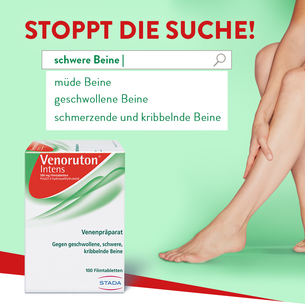 Venoruton® behandelt Venenleiden: Es fördert die Durchblutung, reduziert Schmerzen und Schwellungen an Knöcheln und Beinen, lindert Symptome wie Spannungsgefühl und Kribbeln und hilft gegen das Schwergefühl in den Beinen.