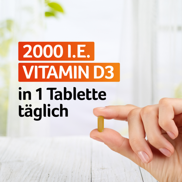 *Vitamin D, Vitamin C, Selen, Zink und Kupfer unterstützen das normale Funktionieren des Immunsystems. *Zudem trägt Vitamin D zum Erhalt gesunder Knochen und einer normalen Muskelfunktion bei. Zink, Selen und Kupfer schützen die Zellen vor oxidativem Stress. Vitamin C trägt zum Erhalt eines normalen Energiestoffwechsel bei. **Nicht verschreibungspflichtige Vitamin-D-Produkte, erhältlich in Apotheken. Insight Health; DatamedIQ, 10/2021. Verzehrempfehlung: Erwachsene nehmen täglich 1 Tablette mit Wasser zu einer Mahlzeit ein. Wichtig: Die empfohlene tägliche Dosis darf nicht überschritten werden. Es sollten parallel keine anderen Nahrungsergänzungsmittel oder Medikamente, die Vitamin D, Vitamin C, Zink, Selen oder Kupfer enthalten, eingenommen werden. Menschen mit Nierenproblemen, erhöhtem Kalziumspiegel (Blut oder Urin) oder einer Neigung zur Bildung von Nierensteinen sollten mit ihrem Arzt sprechen, bevor sie Vitamin-D-Präparate einnehmen. VIGANTOLVIT® IMMUN ist ein Nahrungsergänzungsmittel für Erwachsene. Nahrungsergänzungsmittel sind kein Ersatz für eine ausgewogene, abwechslungsreiche Ernährung und eine gesunde Lebensweise. - Für Kinder unzugänglich lagern. - Trocken lagern. - Nicht bei Temperaturen von über 25 °C lagern. - Weitere Informationen finden Sie unter www.vigantolvit.de