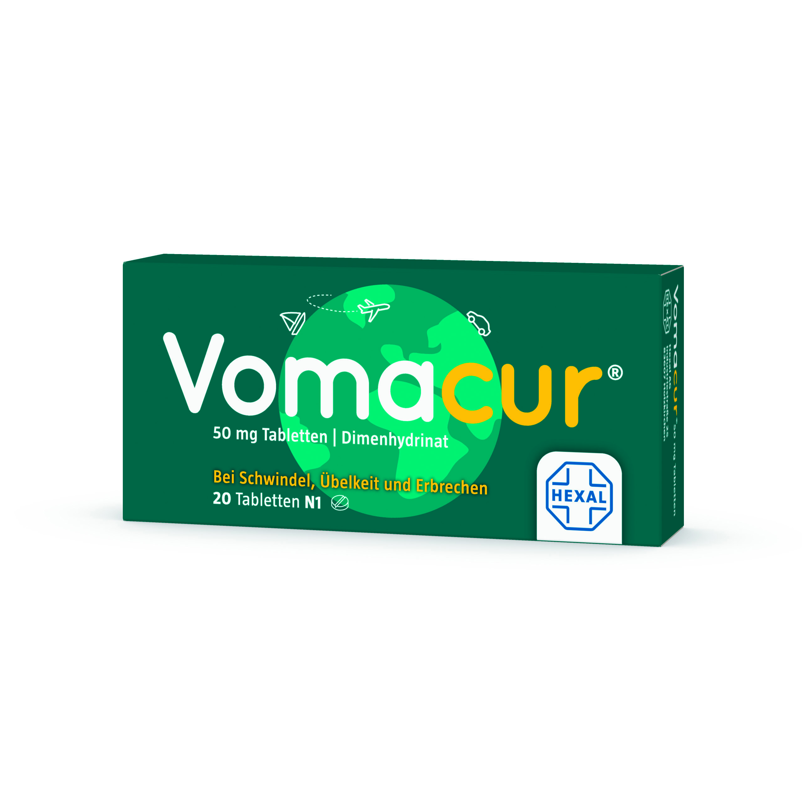 Vomacur® 50 mg Tabletten sind zur Behandlung von Reisekrankheit, Übelkeit, Schwindel und Erbrechen geeignet. Bei bekannter Neigung zu Reiseübelkeit kann das Arzneimittel auch vorbeugend eingenommen werden und lindert das flaue Gefühl in der Magengegend, dank des bewährten Wirkstoffs Dimenhydrinat. Vomacur® 50 mg Tabletten sind bei richtiger Dosierung verträglich und auch für Kinder ab 6 Jahren und über 30 kg Körpergewicht geeignet.
