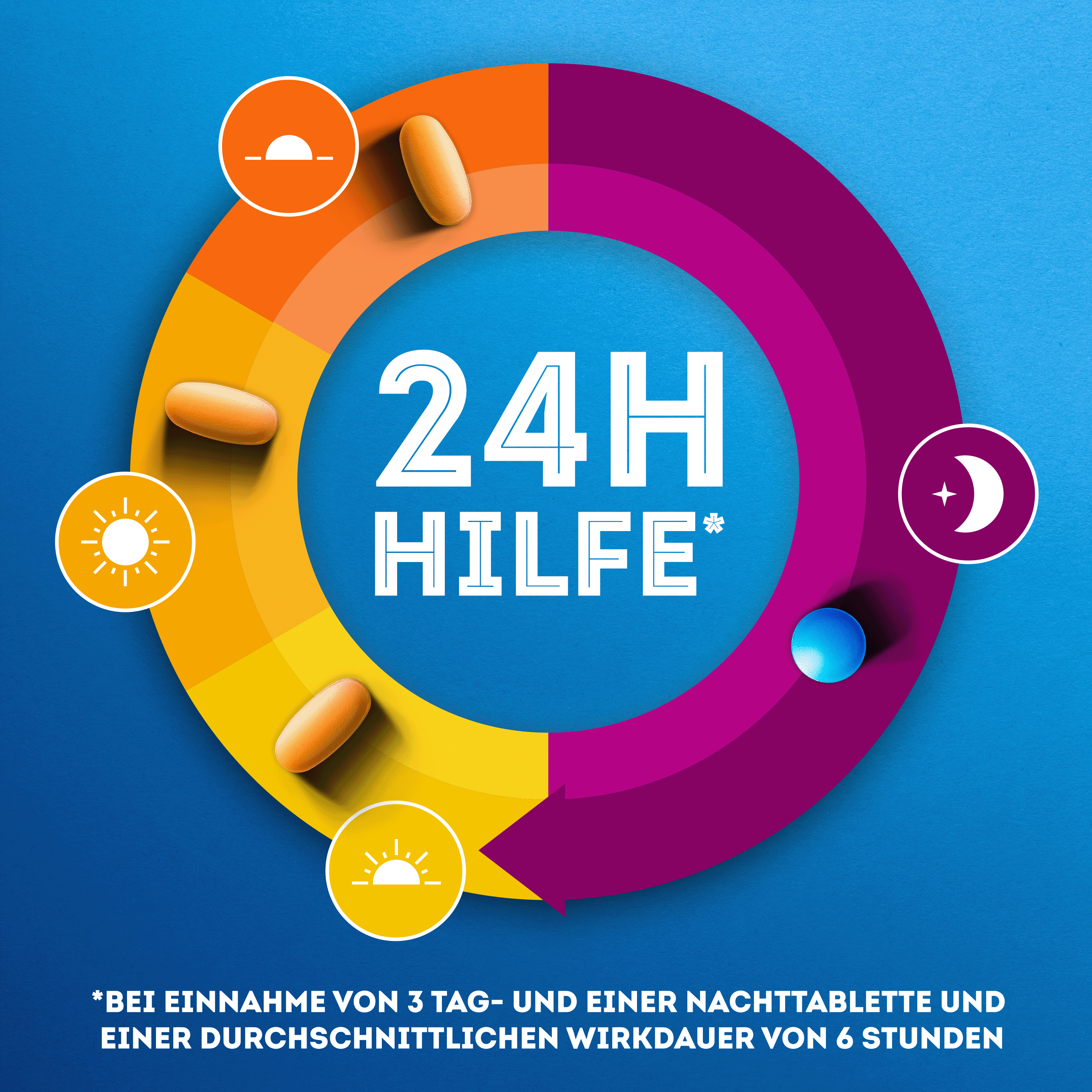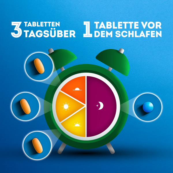 Eine Erkältung stellt das Leben auf den Kopf - wenn wir erkältet sind, fühlen wir uns tagsüber oft völlig erschöpft, können aber nachts nicht schlafen. WICK DayNait hilft Ihnen, Symptome zu lindern und dadurch den Tag zu meistern und nachts zu schlafen. Das Erkältungsmittel lindert Erkältungssymptome am Tag und in der Nacht und hilft gegen Fieber, Kopfschmerzen, Gliederschmerzen, Halsschmerzen, verstopfte Nase und laufende Nase/Niesen. Der praktische, selbsterklärende Blister enthält pro Tag drei spezielle gelbe Tabletten für den Tag und eine spezielle blaue Tablette für die Nacht. So können Sie Ihren Tag aktiver gestalten und in der Nacht besser schlafen. WICK DayNait ist zudem vegan, laktosefrei, glutenfrei und zuckerfrei.